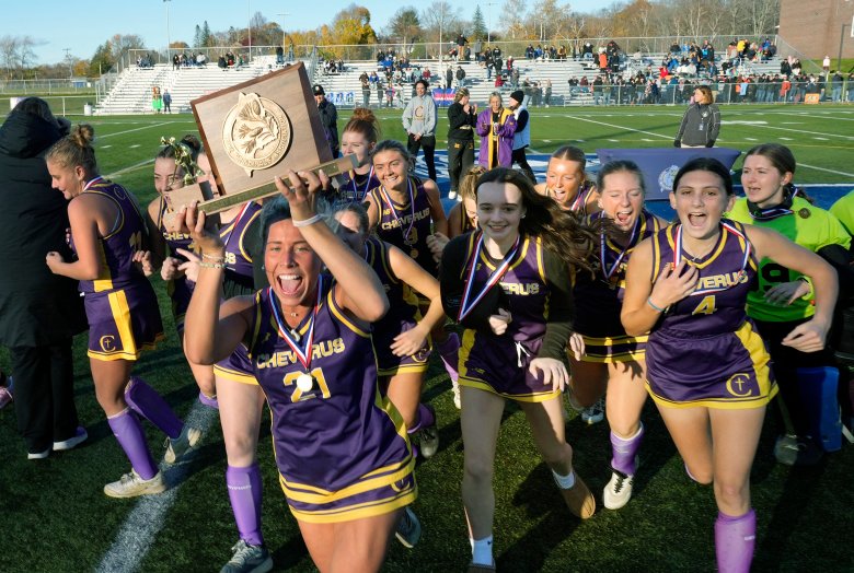Joey Pompeo carries the championship trophy as she leads her Cheverus teammates toward fans after their 3-2 win over Skowhegan in the Class A field hockey state final at Lewiston High School on Saturday. (Gregory Rec/Staff Photographer)