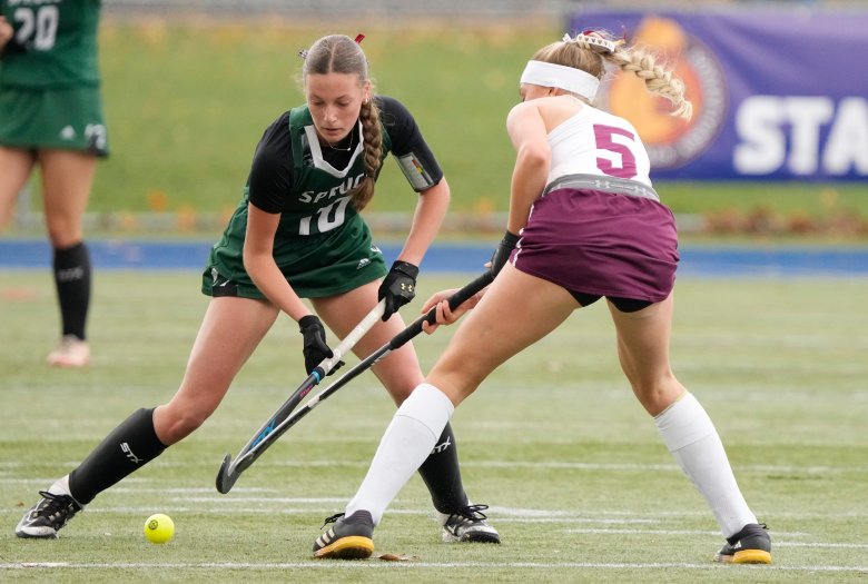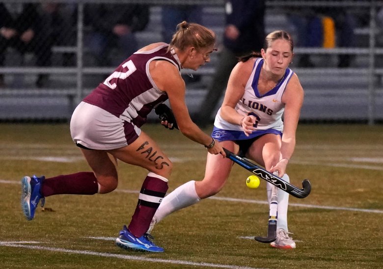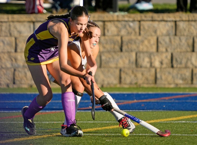 Sydney Brunelle, right, of Cheverus and Jaiden Dodge of Skowhegan battle for control of the ball in the Class A field hockey state championship game at Lewiston High School on Saturday. (Gregory Rec/Staff Photographer)