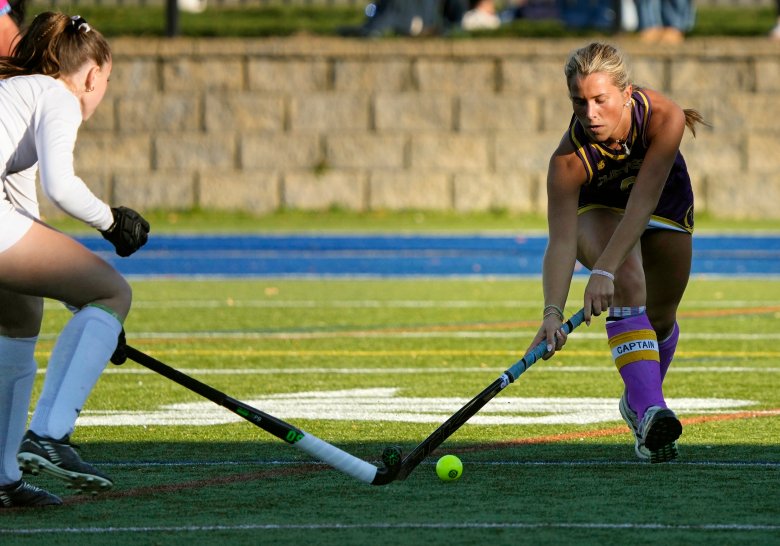 Joey Pompeo of Cheverus moves the ball down the field during the Class A field hockey state championship game against Skowhegan at Lewiston High School on Saturday. (Gregory Rec/Staff Photographer)