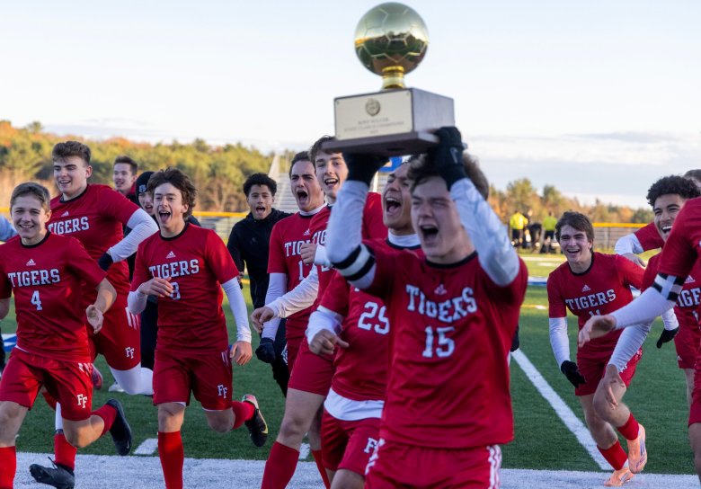 Fort Fairfield's Cayden Ala carries the Gold Ball after the Tigers beat Monmouth 2-1 in the Class D boys soccer state championship game on Saturday in Hermon. (Anna Chadwick/Staff Photographer)