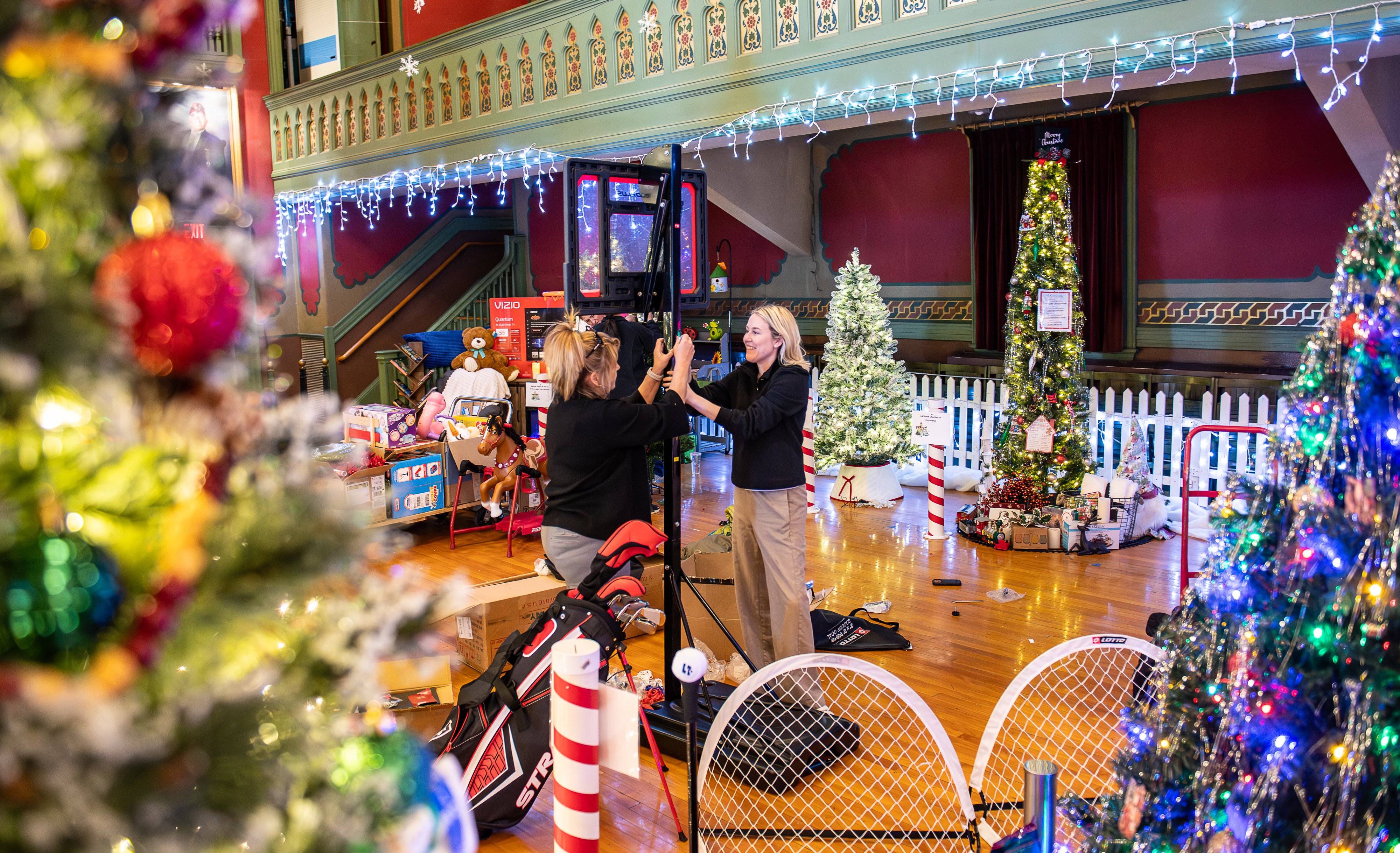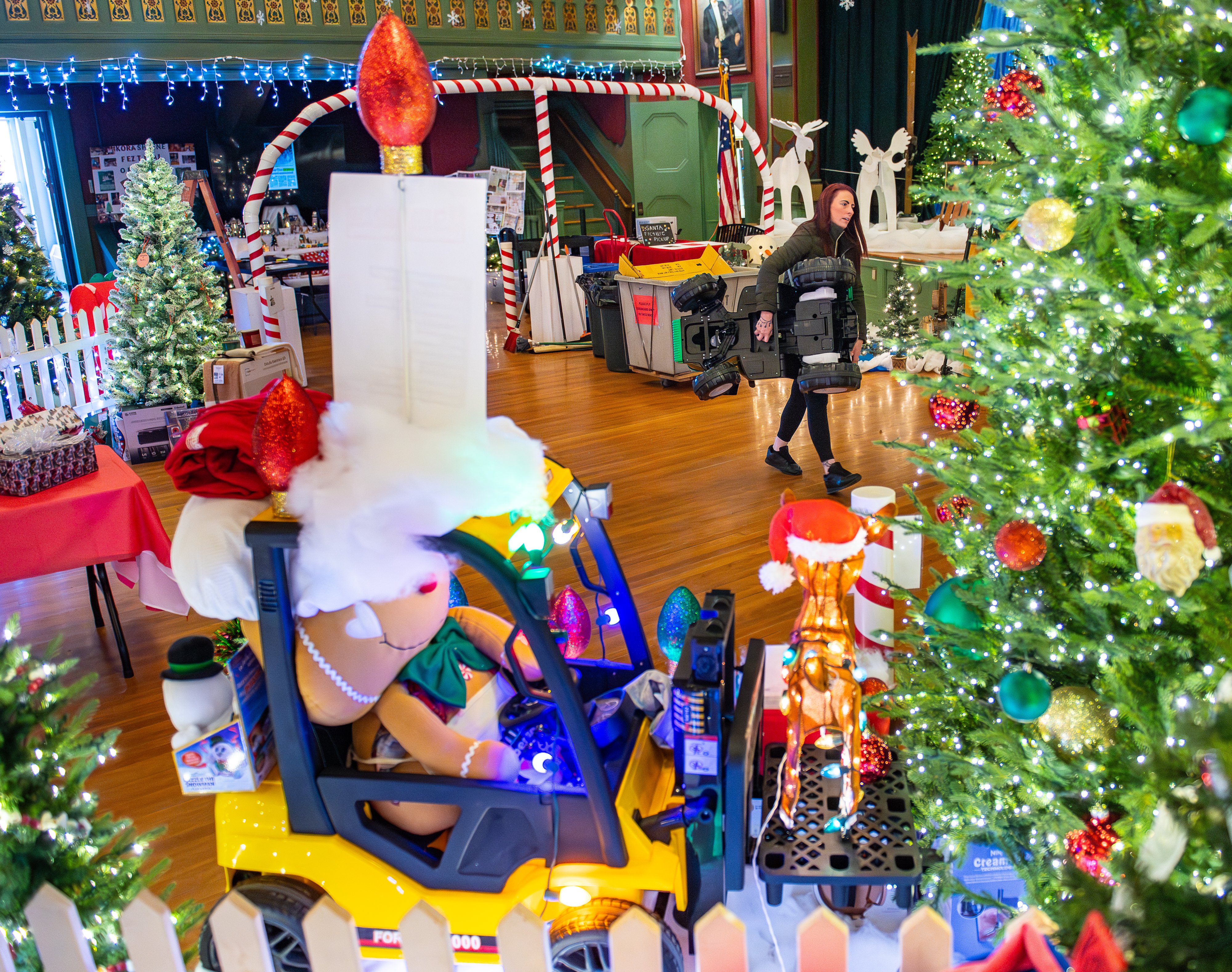 Tammy Thomas, left, and Caroline Emerson assemble a portable basketball hoop Tuesday afternoon at the Kora Shrine Temple at 11 Sabattus St. in Lewiston. The hoop and other sports-related items are part of the theme for the tree their business, Emerson Toyota, donated to the 20th annual FEZtival of Trees, which opens to the public Friday. Reservations to attend the fundraiser can be made online at korashriners.org/feztival-of-trees/. (Russ Dillingham/Staff Photographer)Nikki Rioux, left, Tricia Owczarz, center, and Dr. Emily Burns decorate their tree Tuesday afternoon at the Kora Shrine Temple at 11 Sabattus St. in Lewiston. The co-workers from Riverview Dental Associates are setting up their tree for the Shriners’ 20th FEZtival of Trees. Reservations to attend the fundraiser can be made online at korashriners.org/feztival-of-trees/. (Russ Dillingham/Staff Photographer).Nikki Rioux carries a toy tractor Tuesday afternoon at the Kora Shrine Temple at 11 Sabattus St. in Lewiston as she helps set up for the FEZtival of Trees, which opens to the public Friday. (Russ Dillingham/Staff Photographer)