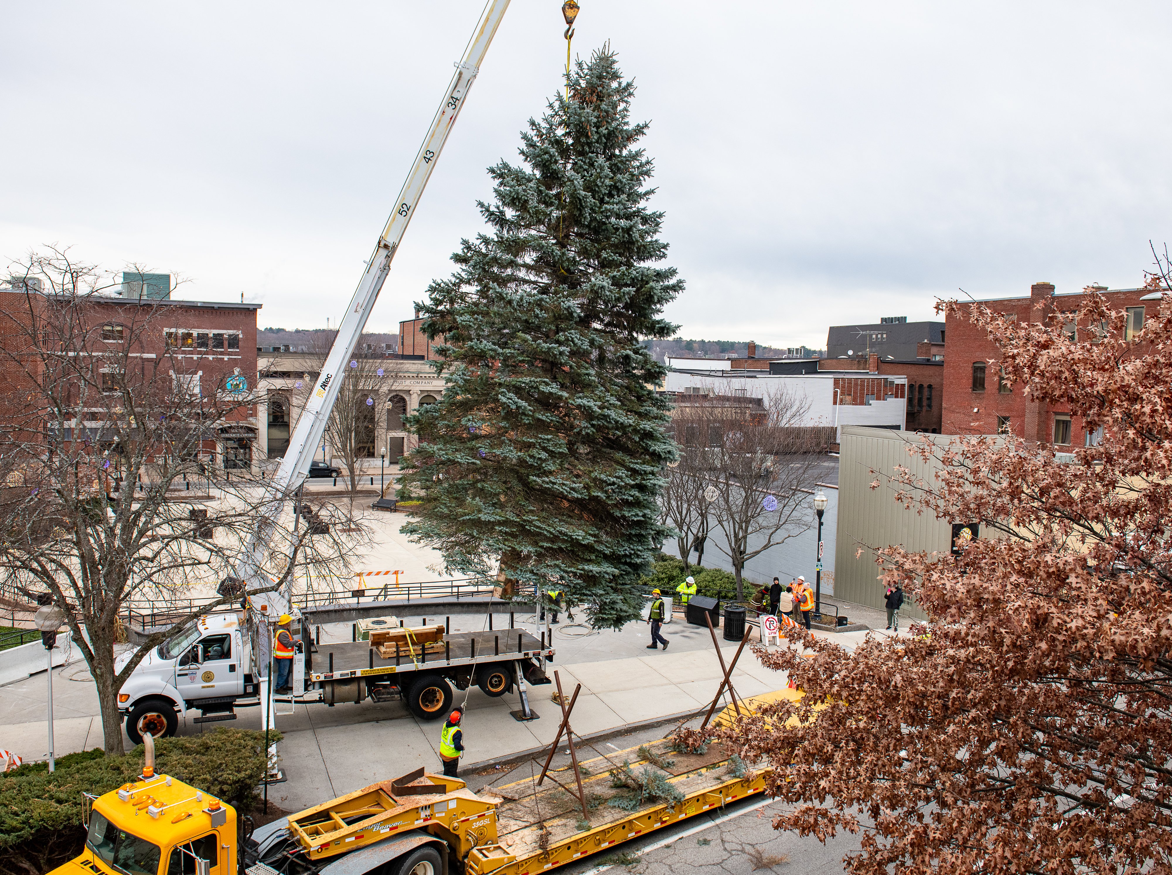 This year’s Lewiston Christmas tree, a 48-foot blue spruce tree cut down from a property on Sabattus Street, is lowered into place Tuesday morning at Dufresne Plaza.