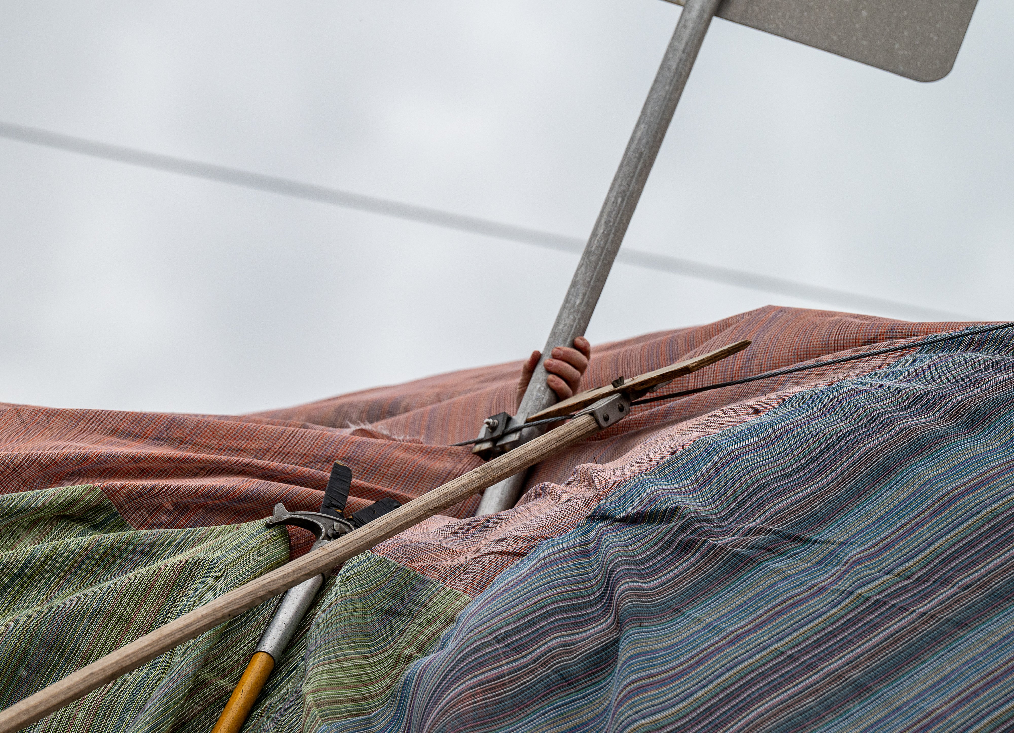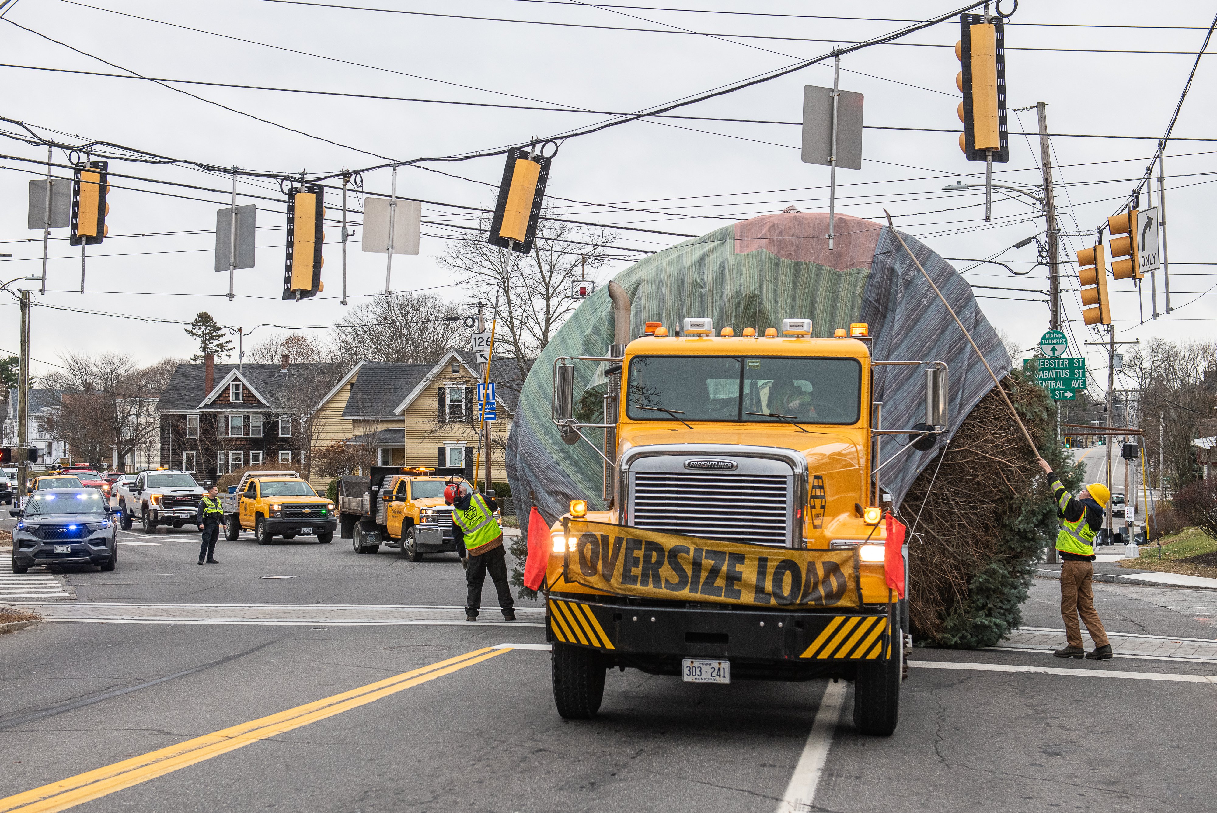 Caelan Pelletier looks in his rearview mirror as he gets signals to inch forward Tuesday morning as co-workers from Lewiston Public Works try to release a tarp covering the 48-foot blue spruce caught on a street sign at the five corners intersection on Sabattus Street. "This was definitely the longest trip since I've been doing this," he said after arriving at Dufresne Plaza.