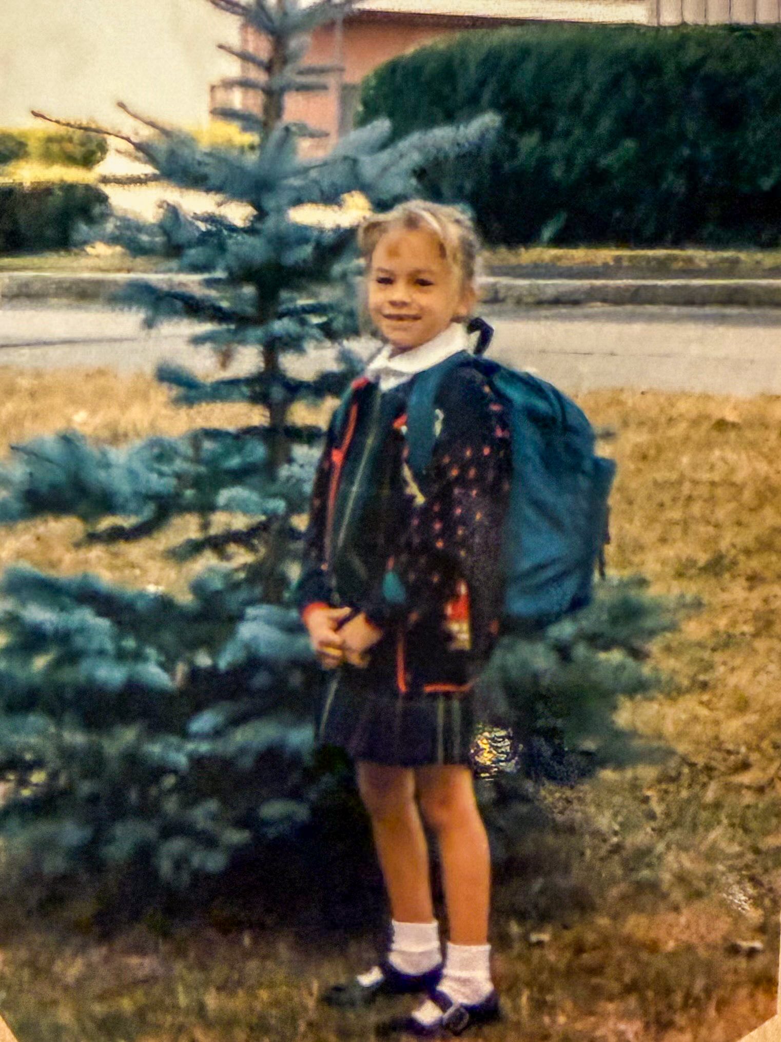 Amber Wolf stands next to a blue spruce tree in her backyard at 458 Sabattus St. in Lewiston on the first day of school in 1994. Her mother took her photo every year in front of the tree, which held so many special memories for the family. The tree was cut down Tuesday to become the city of Lewiston Christmas tree in Dufresne Plaza. (Courtesy photo)