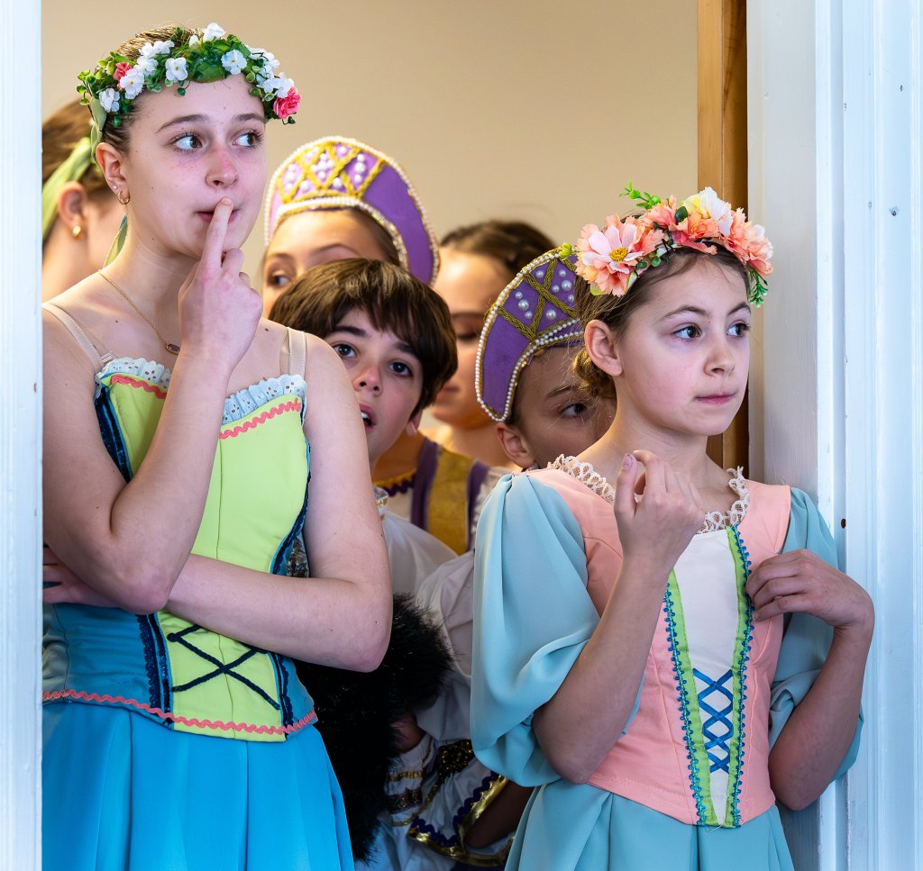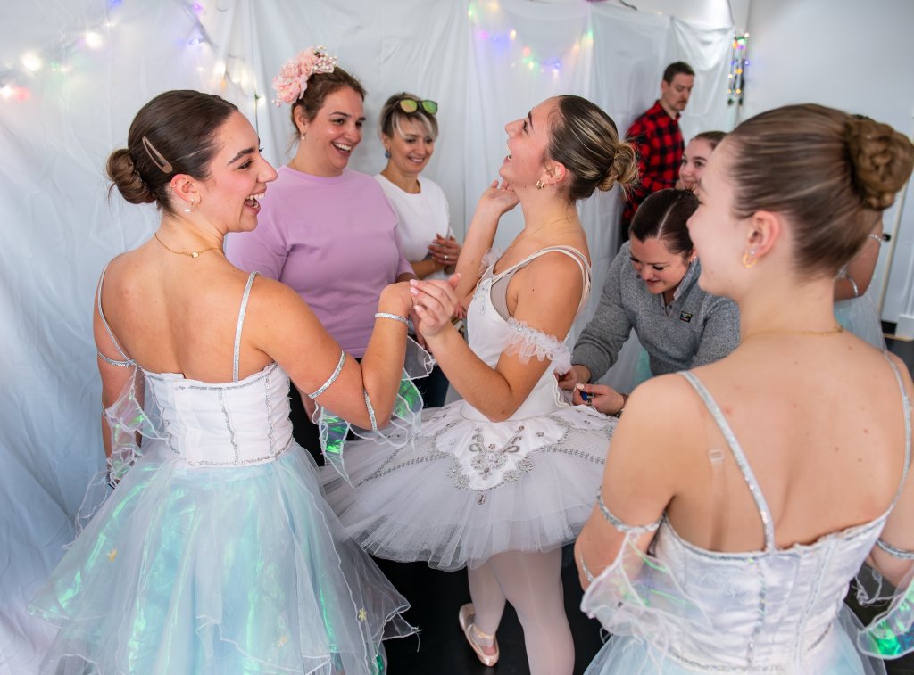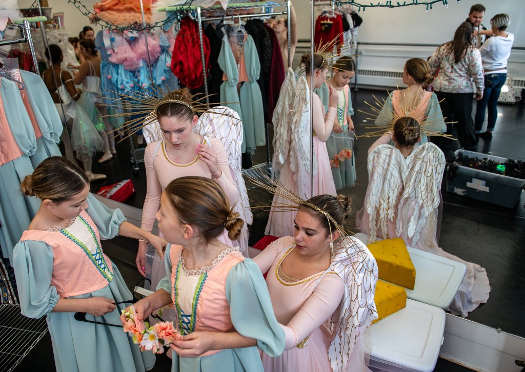 The Dance Center Artistic Director Amelia Pullen, second from left, laughs with dancers for “A Christmas Nutcracker” on Saturday morning at The Dance Center in Auburn. Instructor Lacey Moyse, in gray, fixes the costume of Aliza Pullen. Lauren McBride, left, and Aubrey Collins, right, prepare for the “Waltz of the Snowflakes.” The dancers rehearsed for their performances Friday and Saturday at the Donald M. Gay Performing Arts Center at Edward Little High School on Harris Street in Auburn. For times and tickets, visit: thedancecenterla.com.