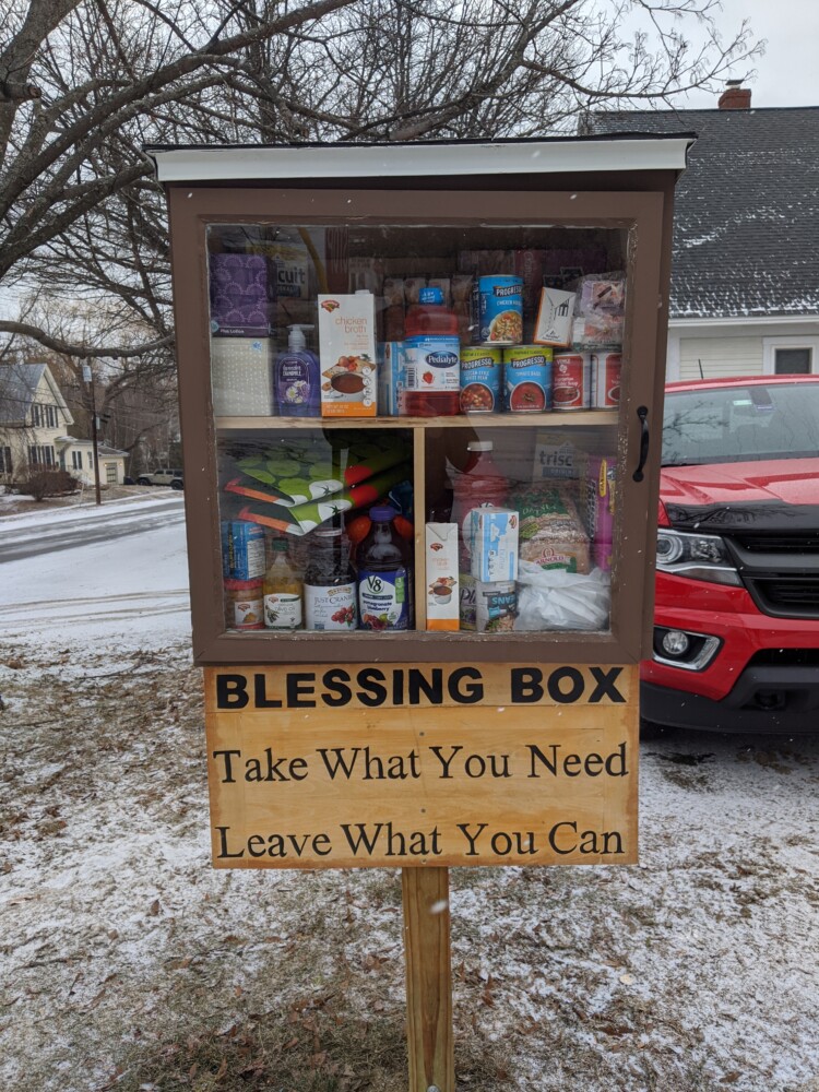 A Blessing Box is a small, outdoor, 24/7 self-serve cabinet where community members can anonymously take food or household items they need and leave donations when they are able.