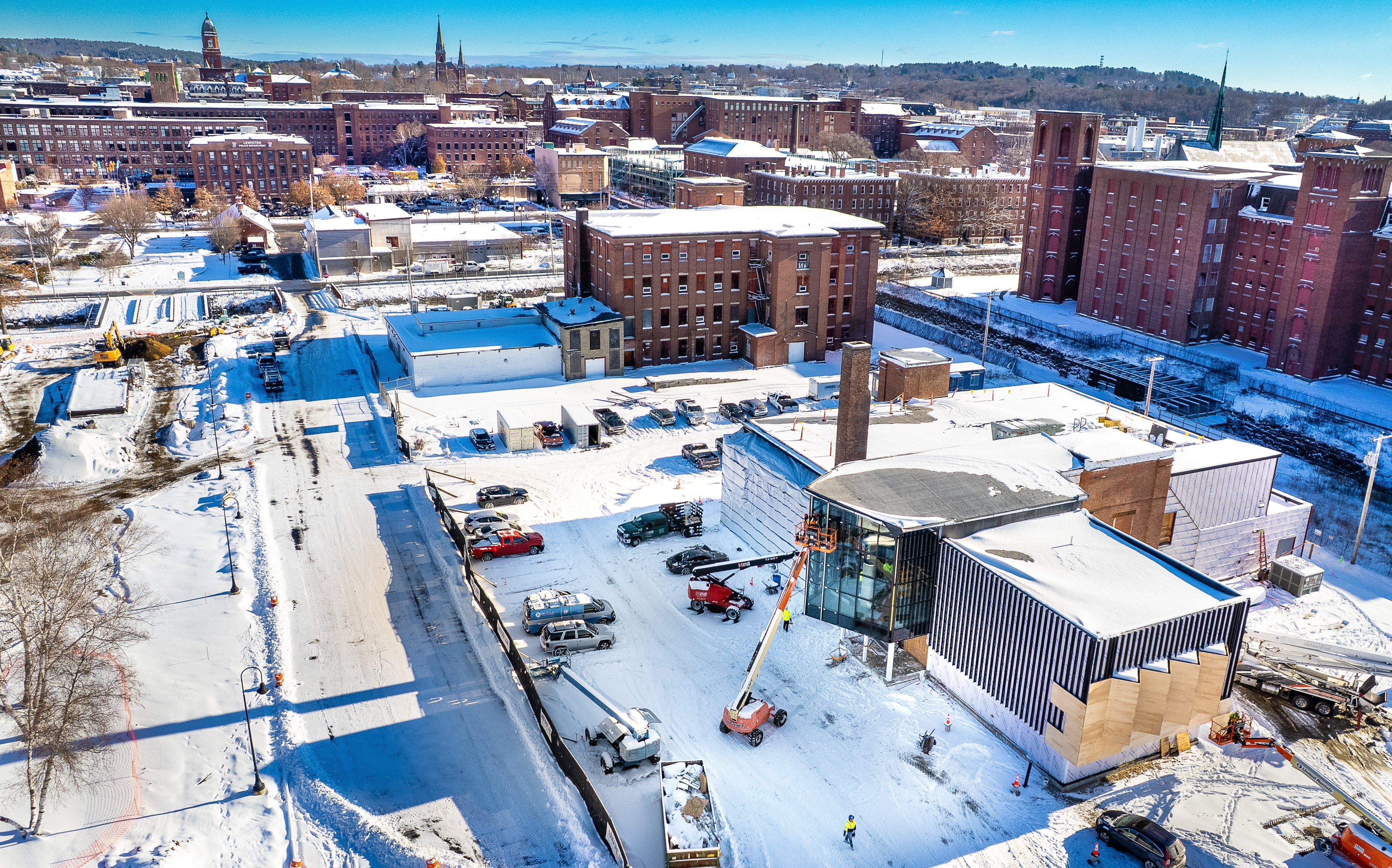 Construction continues Wednesday morning on the new Maine Museum of Innovation, Learning and Labor building, lower right, formerly Museum LA. Programs and exhibits are still ongoing at the museum's current location in the Bates Mill Complex. The new museum building, located next to Simard-Payne Memorial Park in Lewiston, left, will include permanent and rotating exhibit spaces, a learning center, hands-on interactive design lab, children's gallery, Oct. 25 memorial room, and extensive archives and collection storage. It is scheduled to open this summer. For more information about the museum visit mainemill.org.