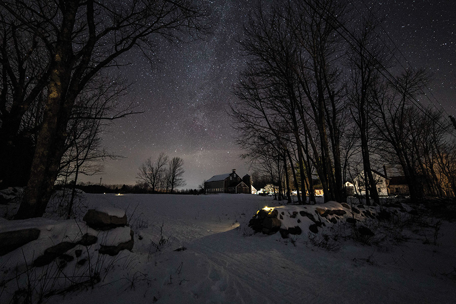 As a dark sky devotee, Meader partners with the Rangeley Lakes Heritage Trust and other land trusts around the state to lead night hikes with telescopes and lasers or hold star parties around the new moon. In the winter, he makes sure he’s properly attired. Snowshoeing to the viewing spot may warm you up, but having a snowsuit, proper boots and moisture-wicking, insulated gloves or mittens will let you space out as long as possible.