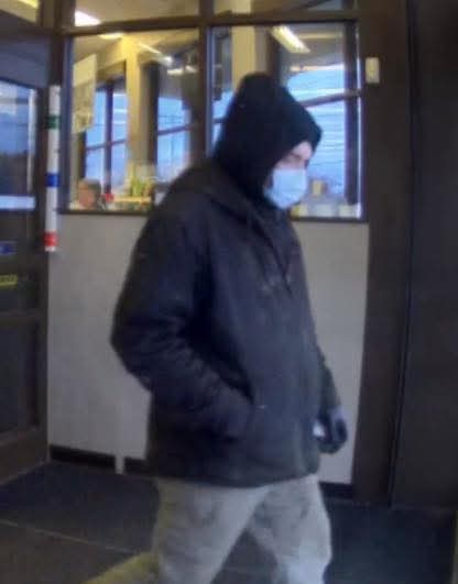 The suspect is described as between 5 feet , 6 inches and 6 feet, 1 inch tall. He was last seen wearing a black hoodie with a black coat over it, gray pants and a blue medical style COVID mask and gloves.