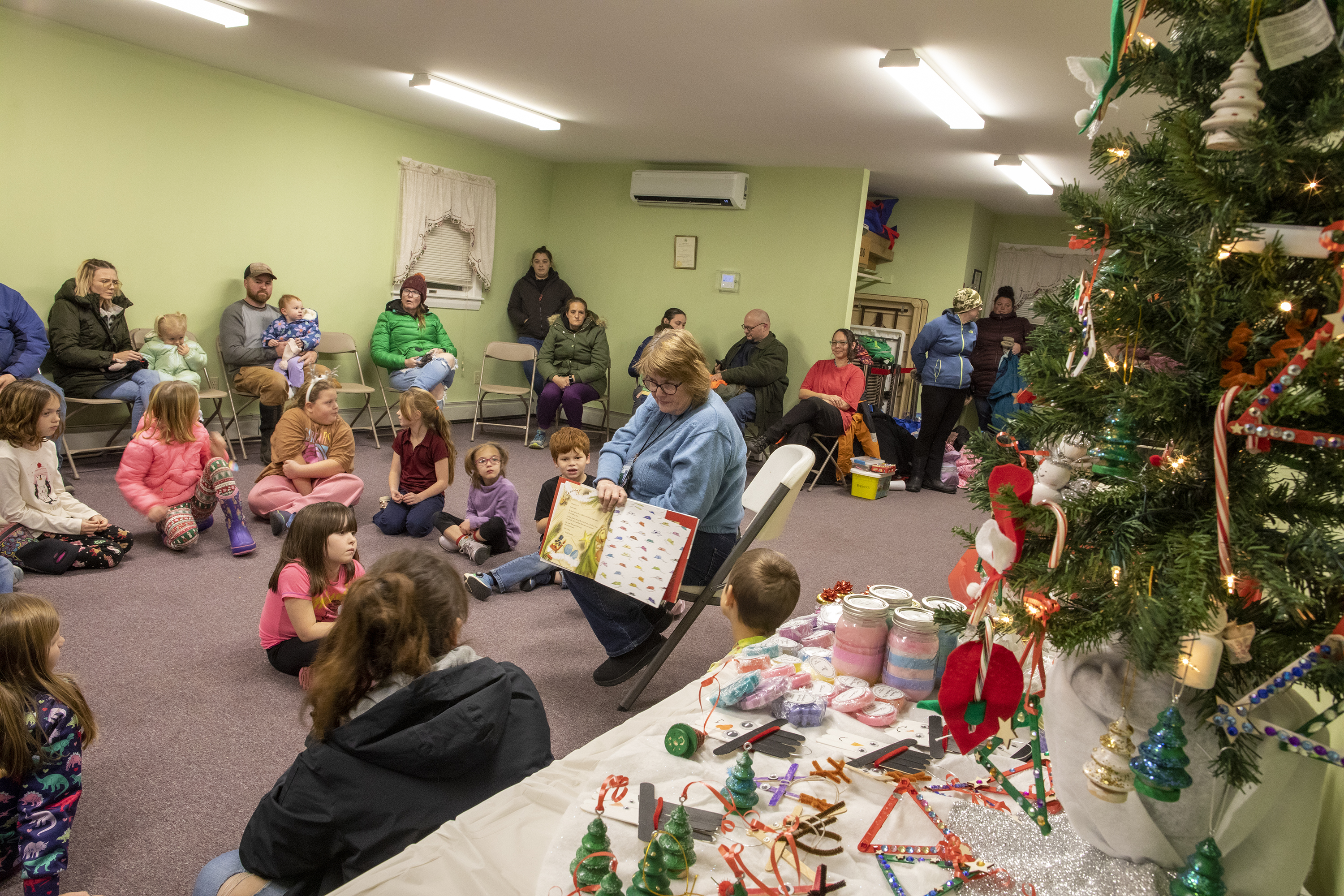West Paris After School Explorer’s Program Director Eileen Storck reads to children inside West Paris Town Office on Dec. 1 before Santa’s arrival. (Rose Lincoln/Staff Writer)