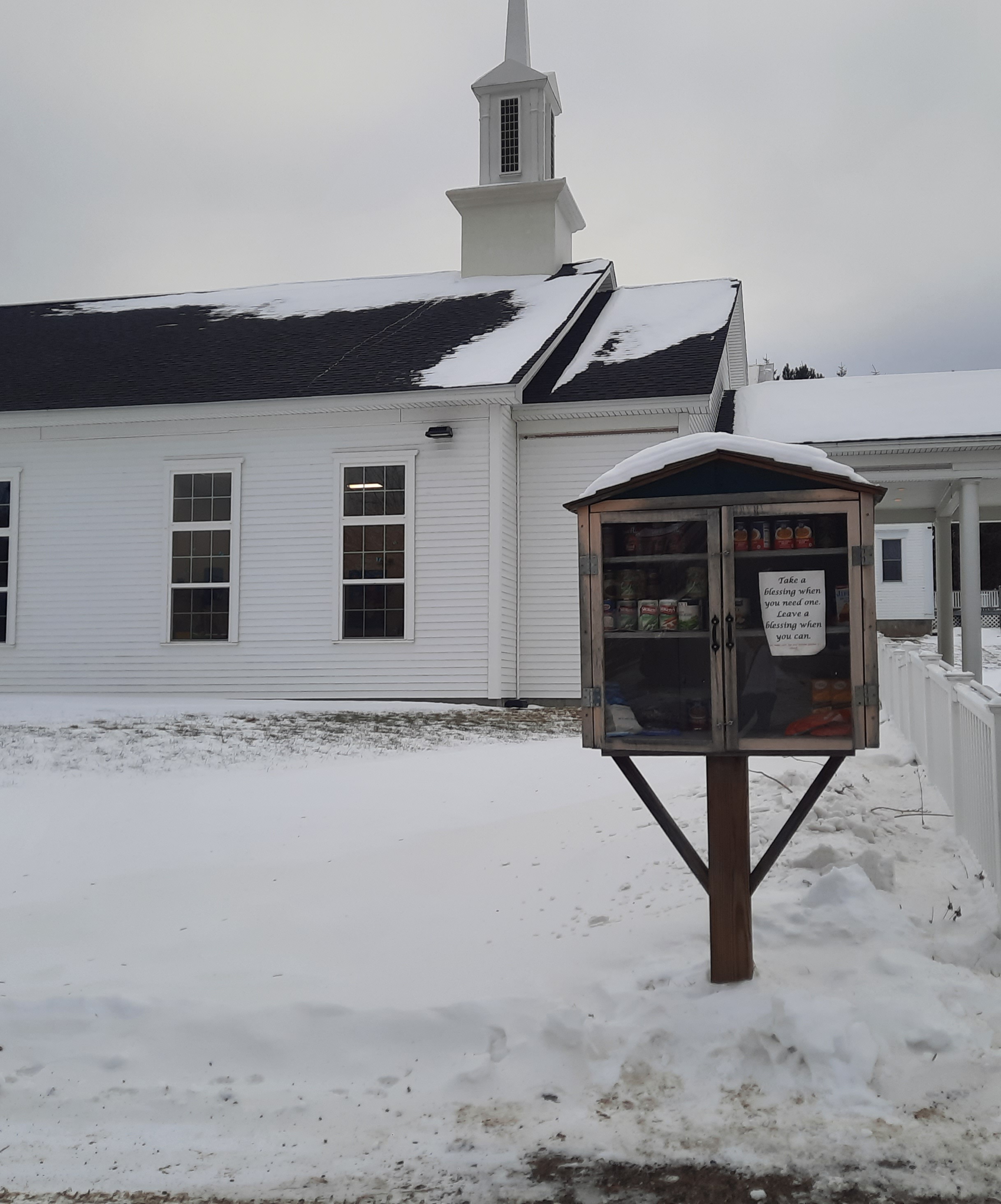 Snow lingers Dec. 6 around the Blessing Box Cupboard at Bean’s Corner Baptist Church, 17 Chesterville Road in Jay, following the Dec. 2 storm. The community-supported cabinet provides easy access to canned goods and dry staples for those who could use a little help. (Rebecca RIchard/Staff Writer)
