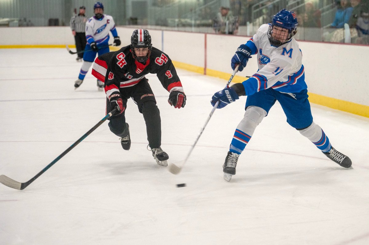 Messalonskee's Denny Martin, right, send the puck up the ice as Camden Hills' Barlow Marshall defends during a Jan. 7, 2025, game. (Joe Phelan/Staff Photographer)