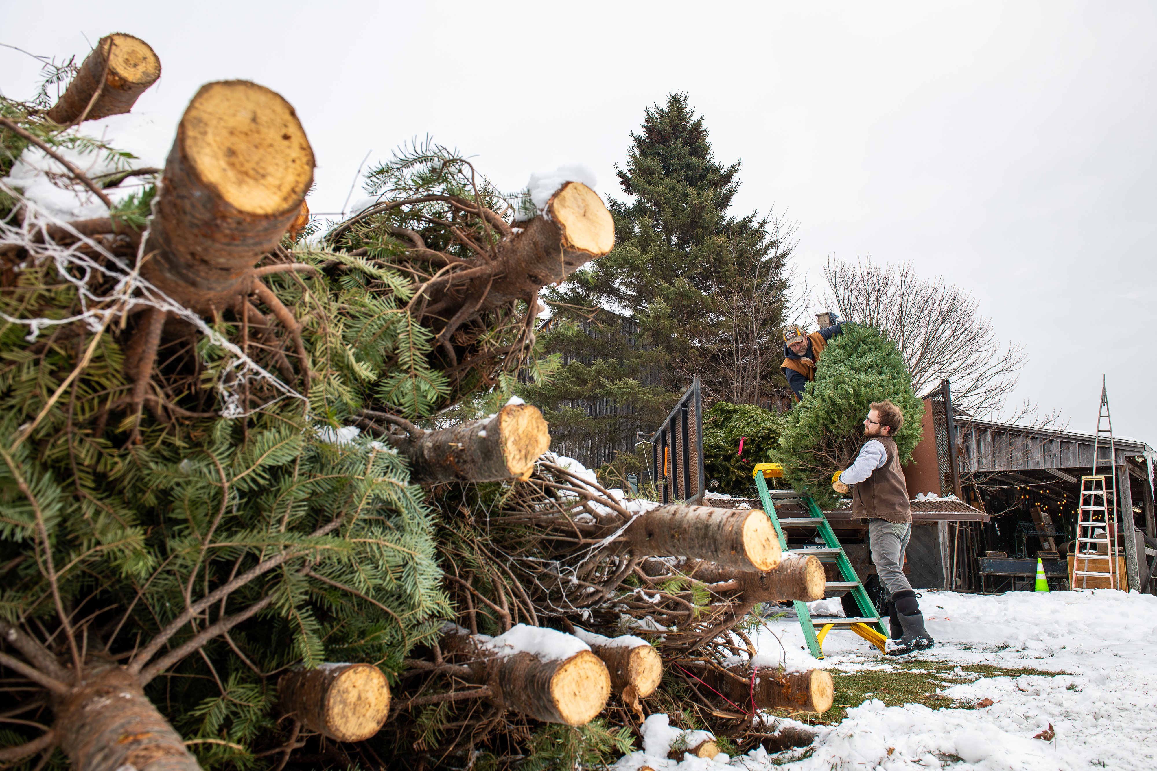Eli Thompson, right, and Rusty Hodgkin unload the last batch of Christmas trees Wednesday at Thompson’s Orchard on Gloucester Hill Road in New Gloucester. “We got 600 trees to sell and most of them will be gone after this weekend,” said Thompson, whose father owns the orchard where they also sell wreaths, baked goods, and stocking stuffers. (Russ Dillingham/Staff Photographer)