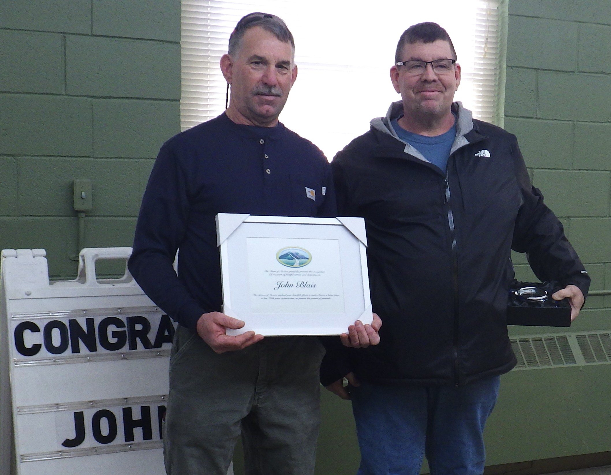 Blais, who began working for the department Dec. 1, 1980, said, “I want to thank everybody and my crew. We had a good crew. And especially my wife. She was there when I started and she was there when I stopped. She put up with a lot.”
