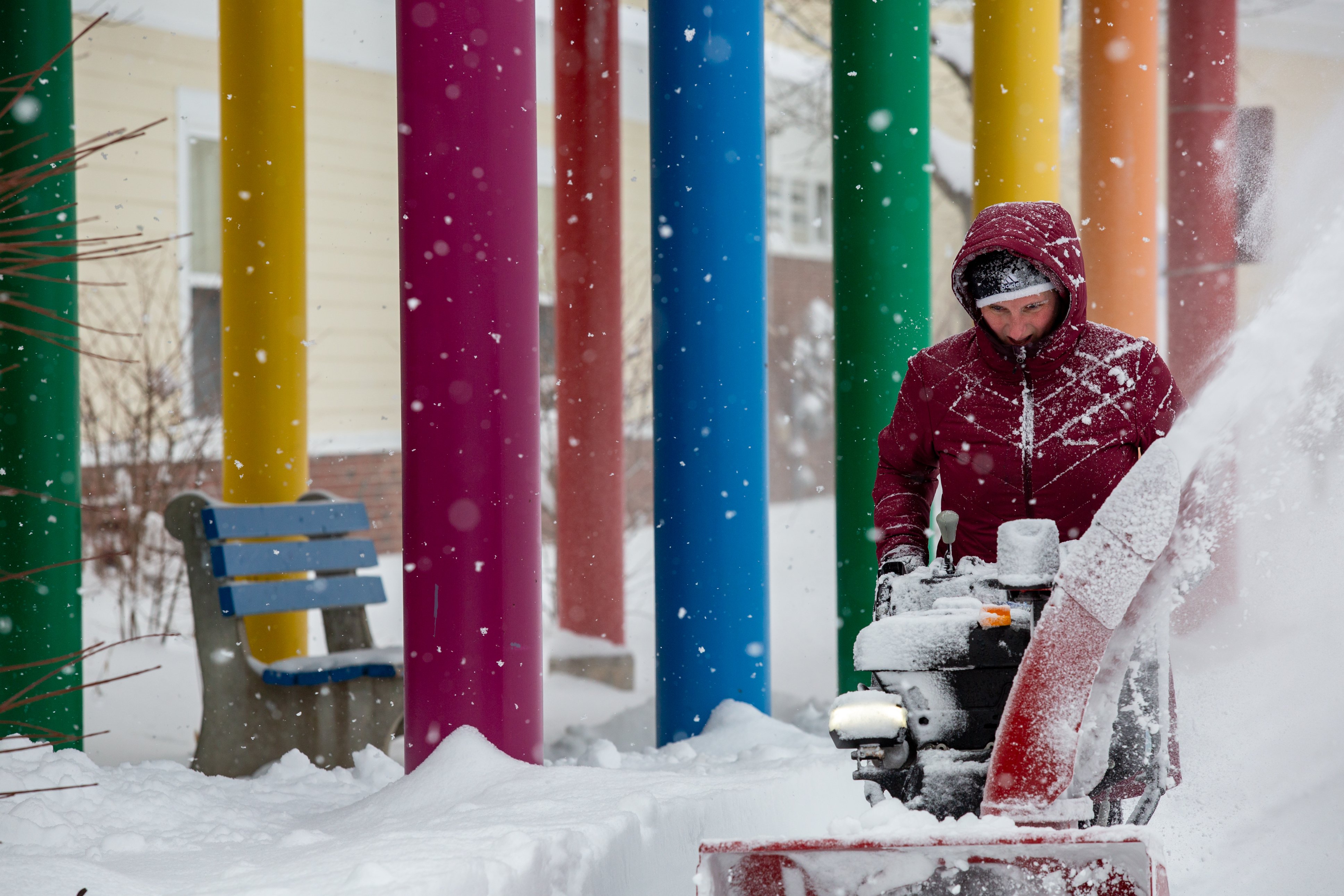 Sarah Wing snowblows the front of Washburn Elementary School in Auburn on Dec. 24. Some areas in the state got more than a foot of snow in the storm. (Libby Kamrowski Kenny/Staff Photographer)