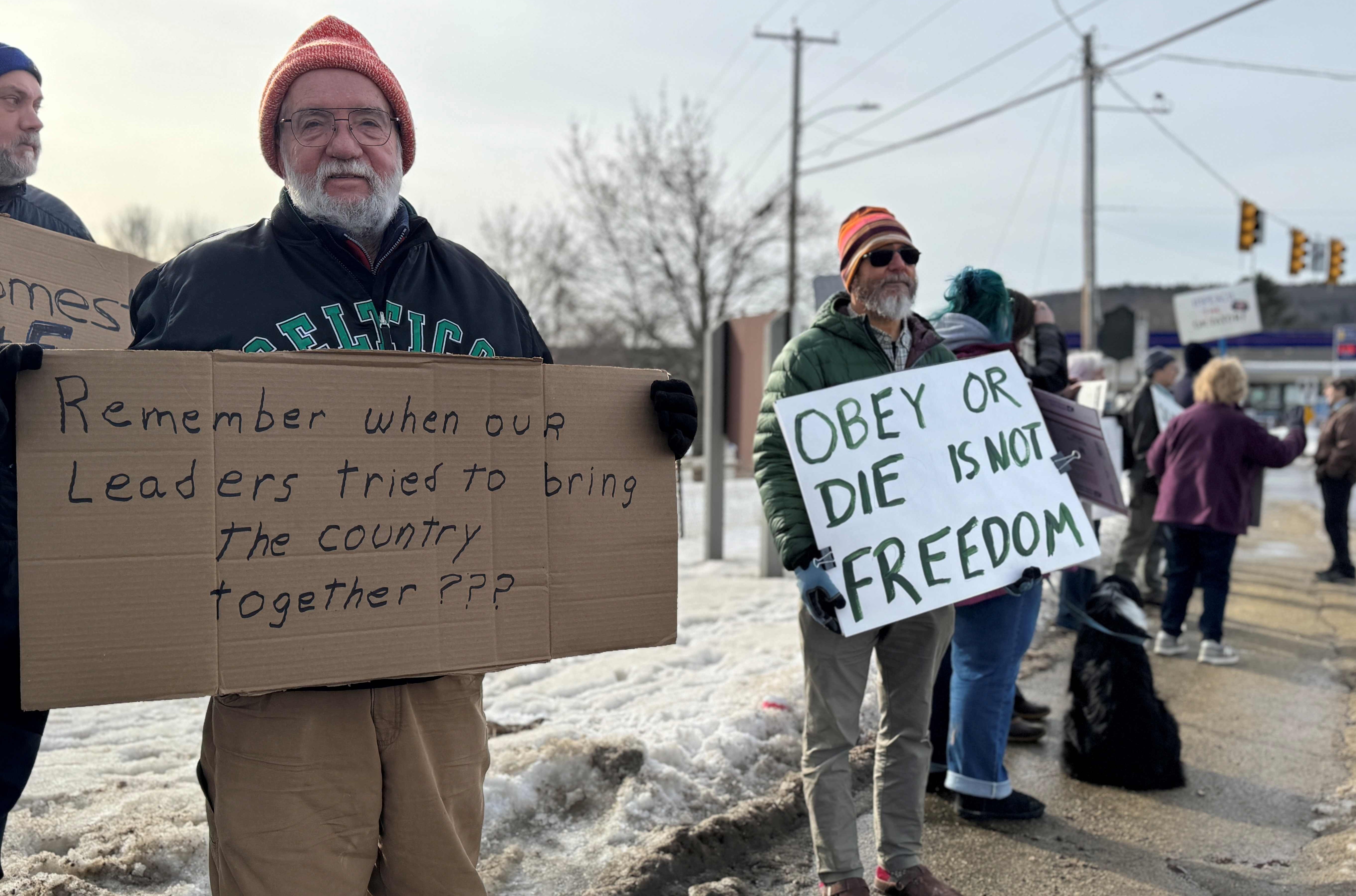 Scott Campbell, of Paris Hill, left, and Rick Meagher, of Norway, are two of about 40 people who demonstrated Saturday at an ICE Out! Rally on the corner of Fair Street in Norway and Main Street in Paris. “I have deep concerns about where our country is heading and for the failure of our leaders. There was a time when our presidents talked about being kinder and gentler,” Campbell said. “You don’t see that anymore. It’s deeply disturbing.” Added Meagher: “I’m super concerned about our country, especially in regards to the recent happenings in Minnesota with ICE. Not only for this specific incident but the culture being fostered by our administration, where might makes right.” The event was organized nationally by Indivisible and locally by Western Maine Take Action. (Nicole Carter/Staff Writer)