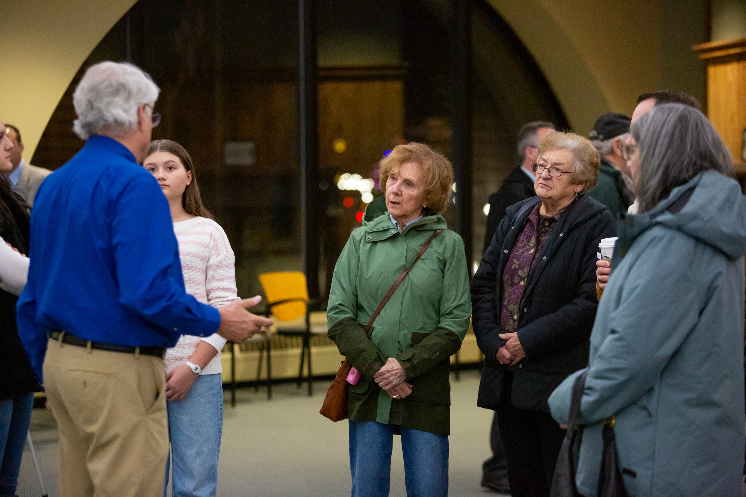 Visitors listen Thursday to board member Gerry Nadeau give details about the future St. Dominic Regional High School during an open house at the new location in the former Peck Building at 184 Main St. in Lewiston. The faith-based school will hold another open house Monday from 1-3 p.m. It will open for its first classes in August or early September for the 2026-27 school year. (Libby Kamrowski Kenny/Staff Photographer)