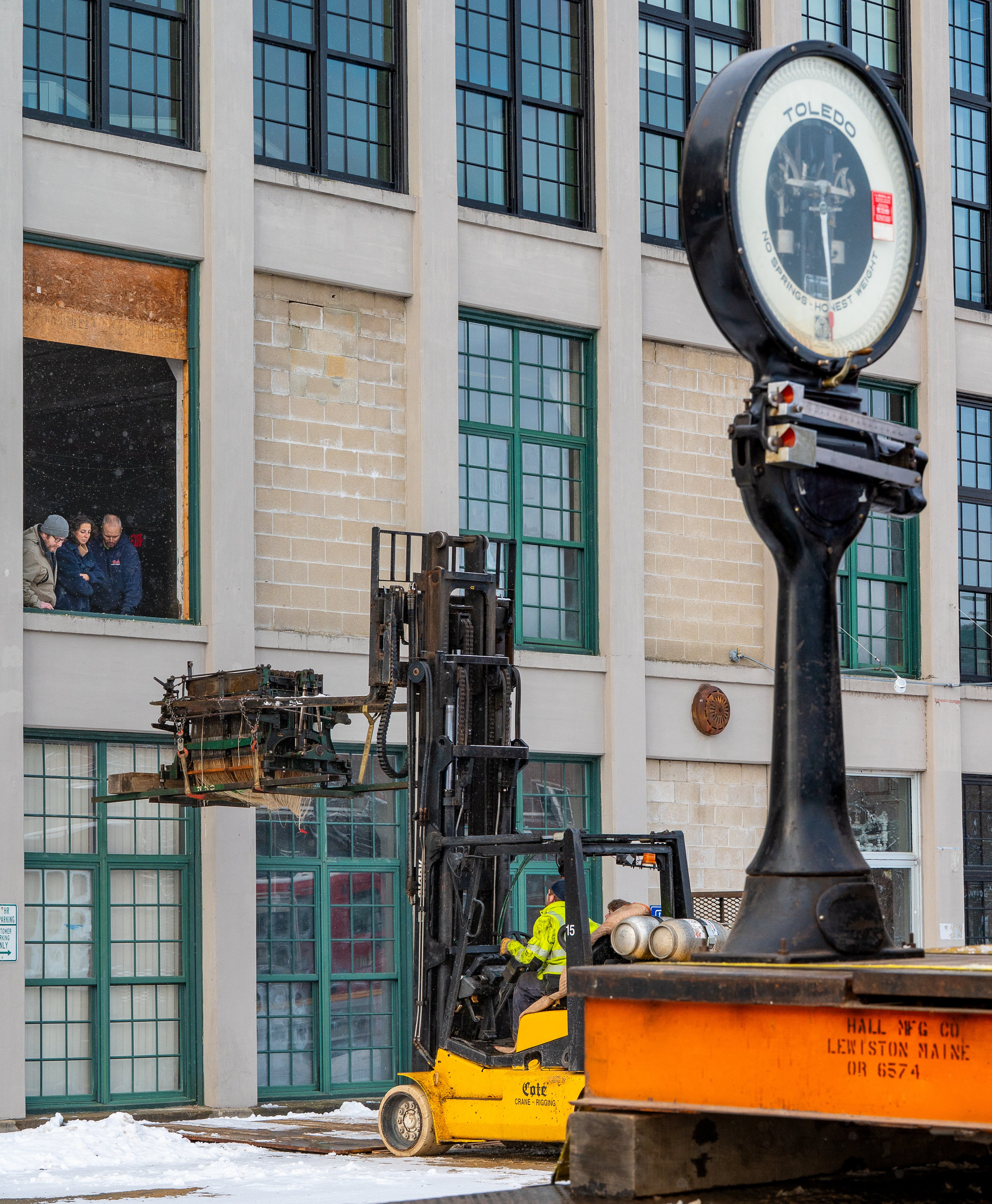Cody Castonguay of Cote Crane & Rigging lowers the head of a Jacquard loom Monday morning from the second story of the Bates Mill Complex in Lewiston, where the Maine MILL has it’s permanent collection. The loom and scale, right, were the first two major pieces moved to the new location of the Museum of Innovation Learning and Labor next to Simard-Payne Memorial Park in Lewiston.