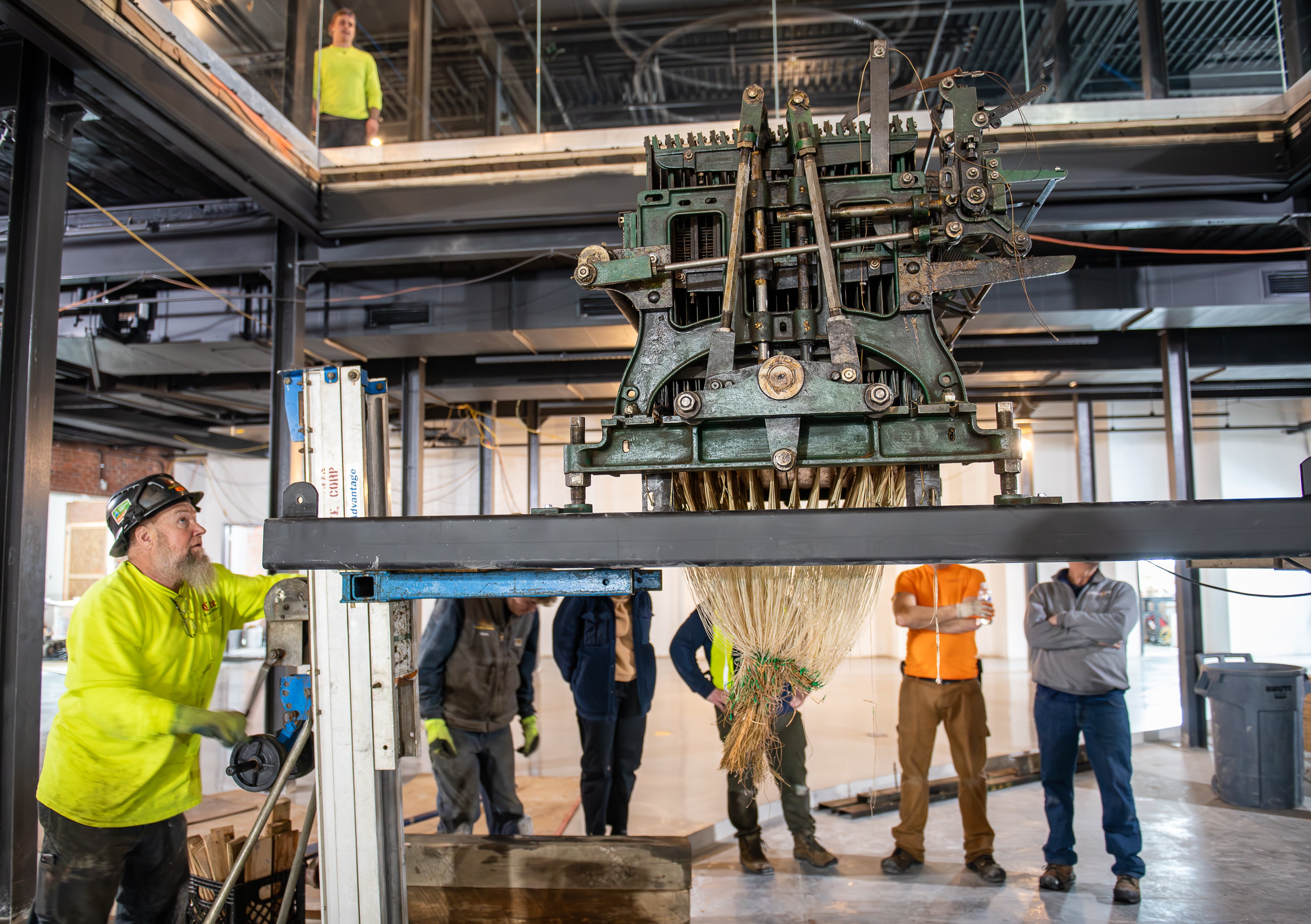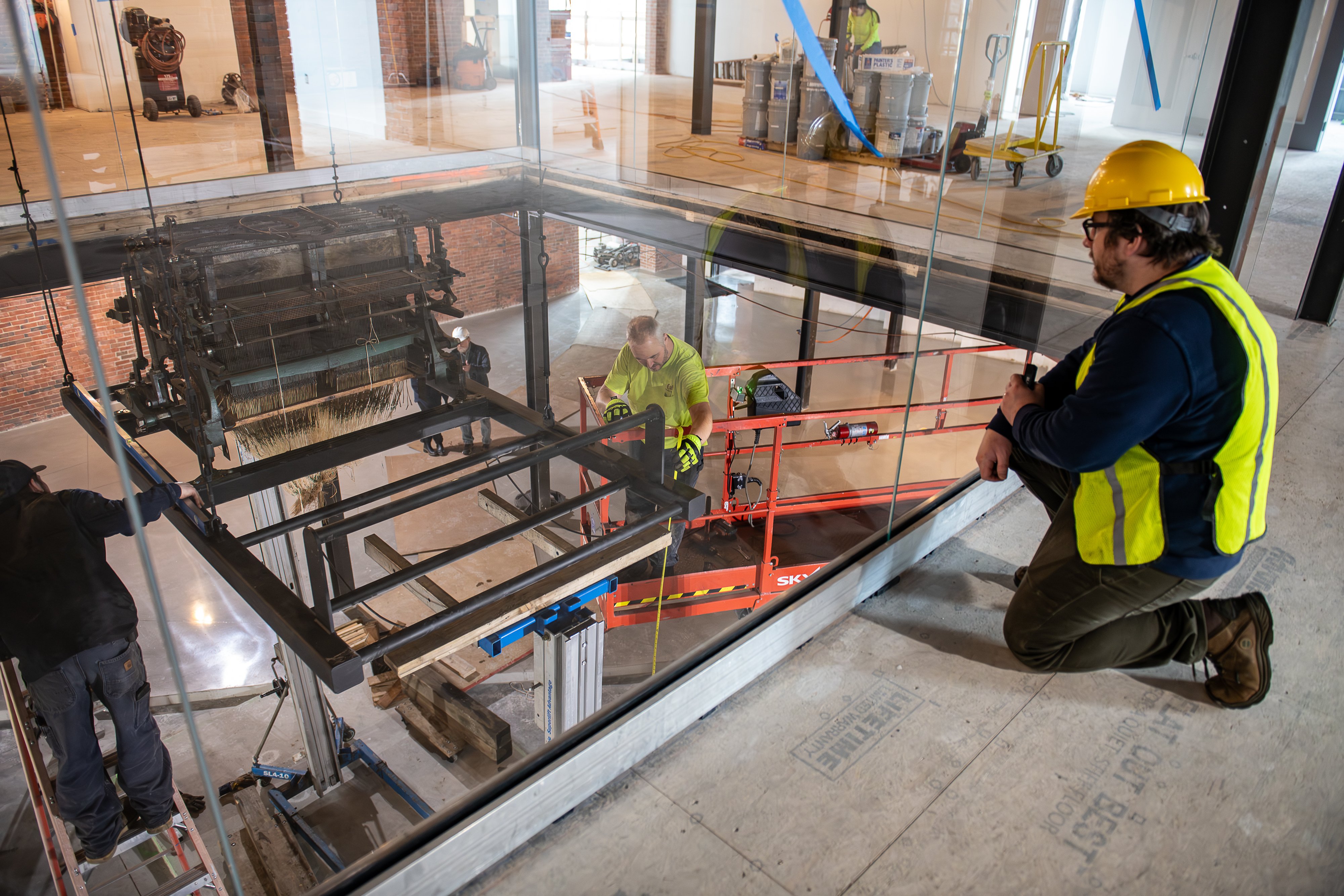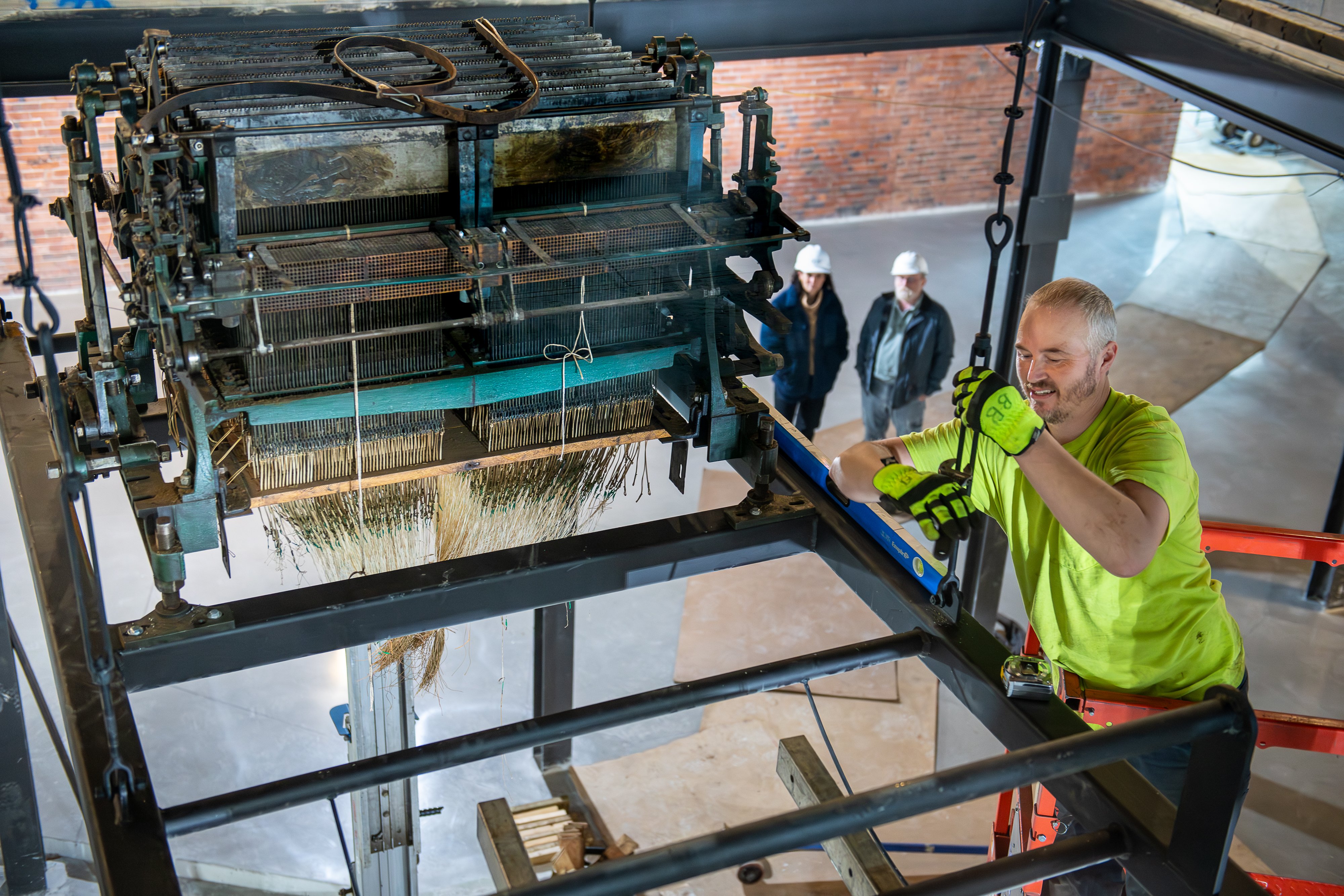 Chris Sullivan, a consultant with Maine MILL and project manager for the new permanent exhibit, looks on as the head of a Jacquard loom is installed in the new location of the museum. The loom can be viewed from the second floor, enclosed in a wall of glass.