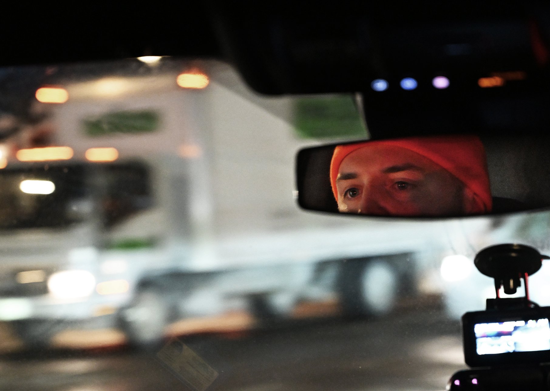 As he pulled into an empty church parking lot, the lights and cars gave way to quiet darkness.