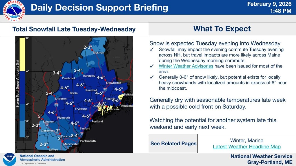 The National Weather Service has placed southern, central and Down East Maine and all of New Hampshire under a winter weather advisory that’s in effect from 7 p.m. Tuesday to 4 p.m. Wednesday.