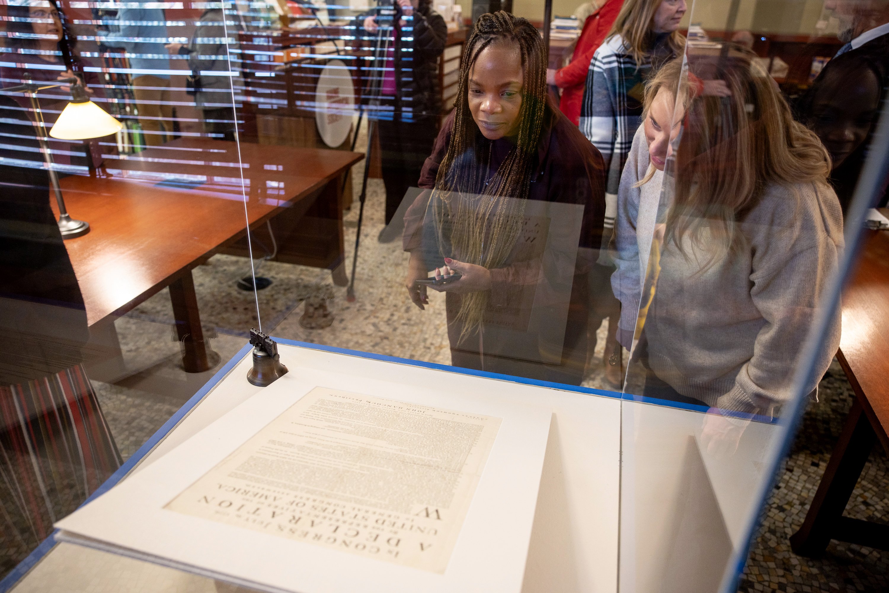 Since the historical society could not find images of these people, Penobscot artist Shannon Sockalexis created life-sized illustrations, based on research about each person or their relatives. The exhibit includes other artifacts, including a Revoloutionary-era martime flag with 13 stars, and a 250-year-old copy of the Declaration of Indpendence known as a Dunlap Broadside. The document is one of 26 known to have survived from an early printing in Philadelphia on July 4, 1776. In July, the document will begin a free tour of locations in all 16 Maine counties, which will end in October.