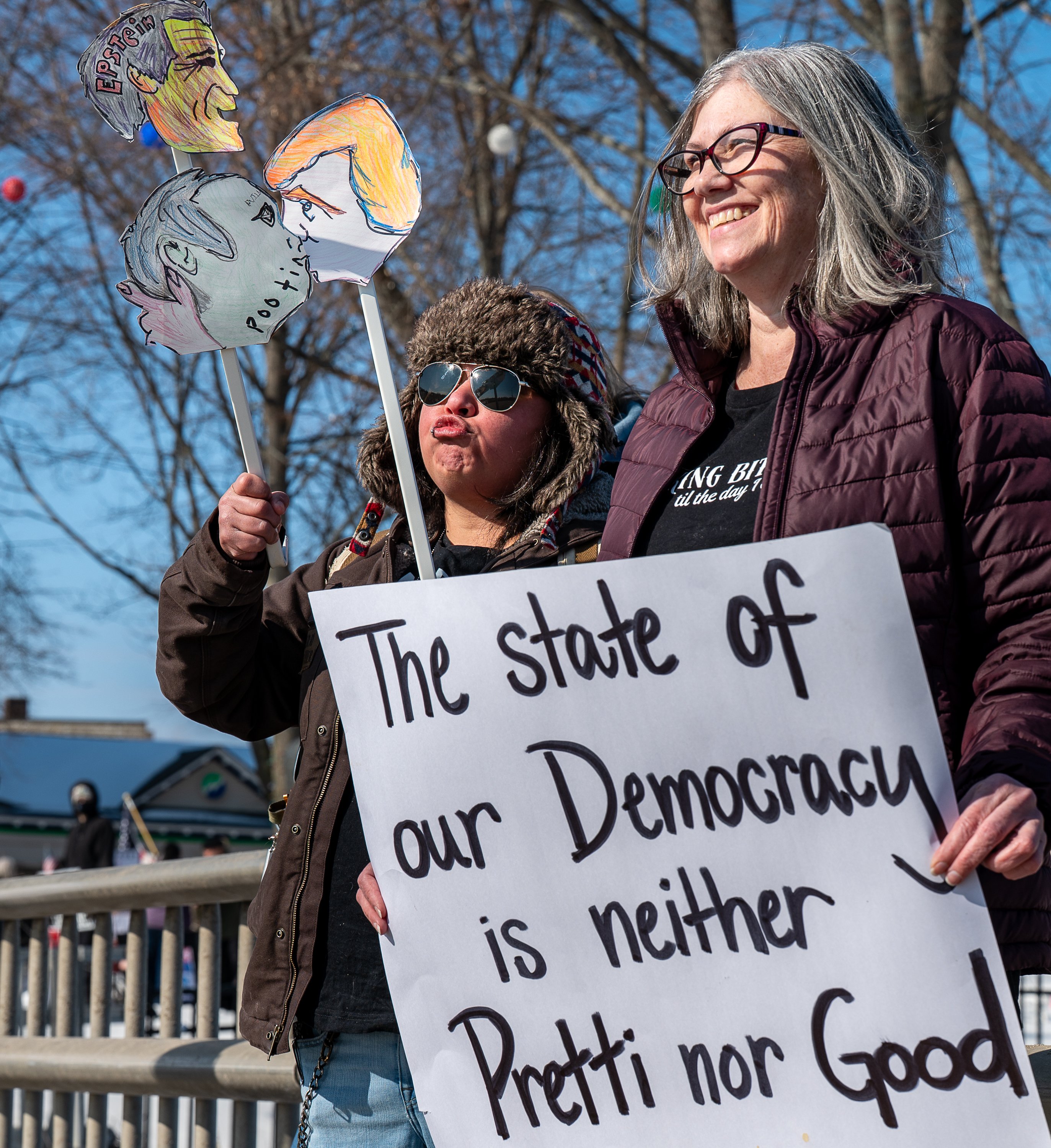 Jen Lowell, right, and Terri St. Amant of Buckfield joined about 100 people Monday afternoon on the Auburn side of the James B. Longley Bridge. There were other “Not This President” protests throughout the country on the Presidents Day holiday. “It just made sense to come out today.” St. Amant said. “How can we celebrate a fascist president?” Lowell asked.
