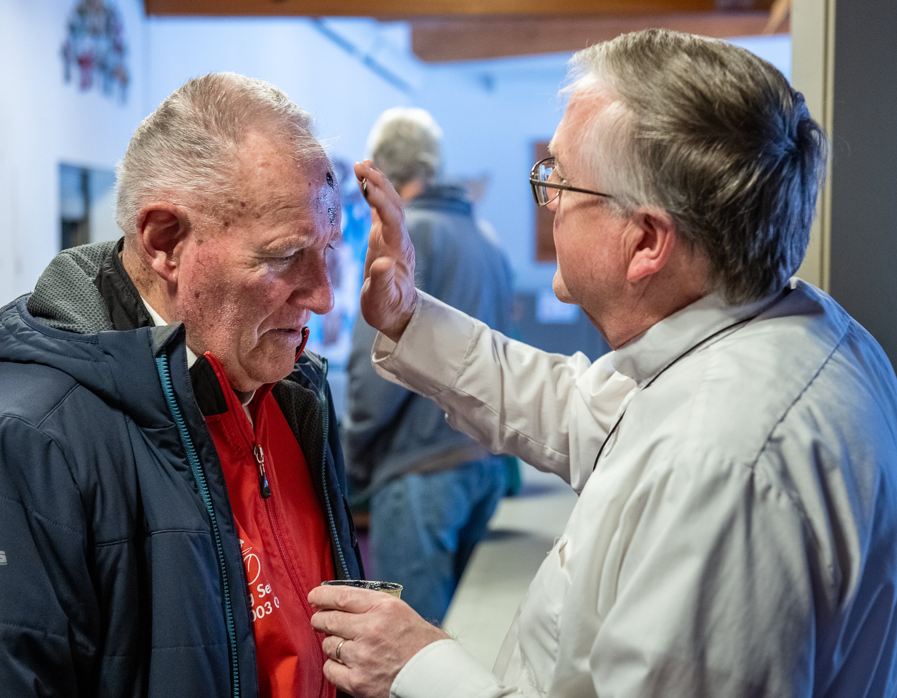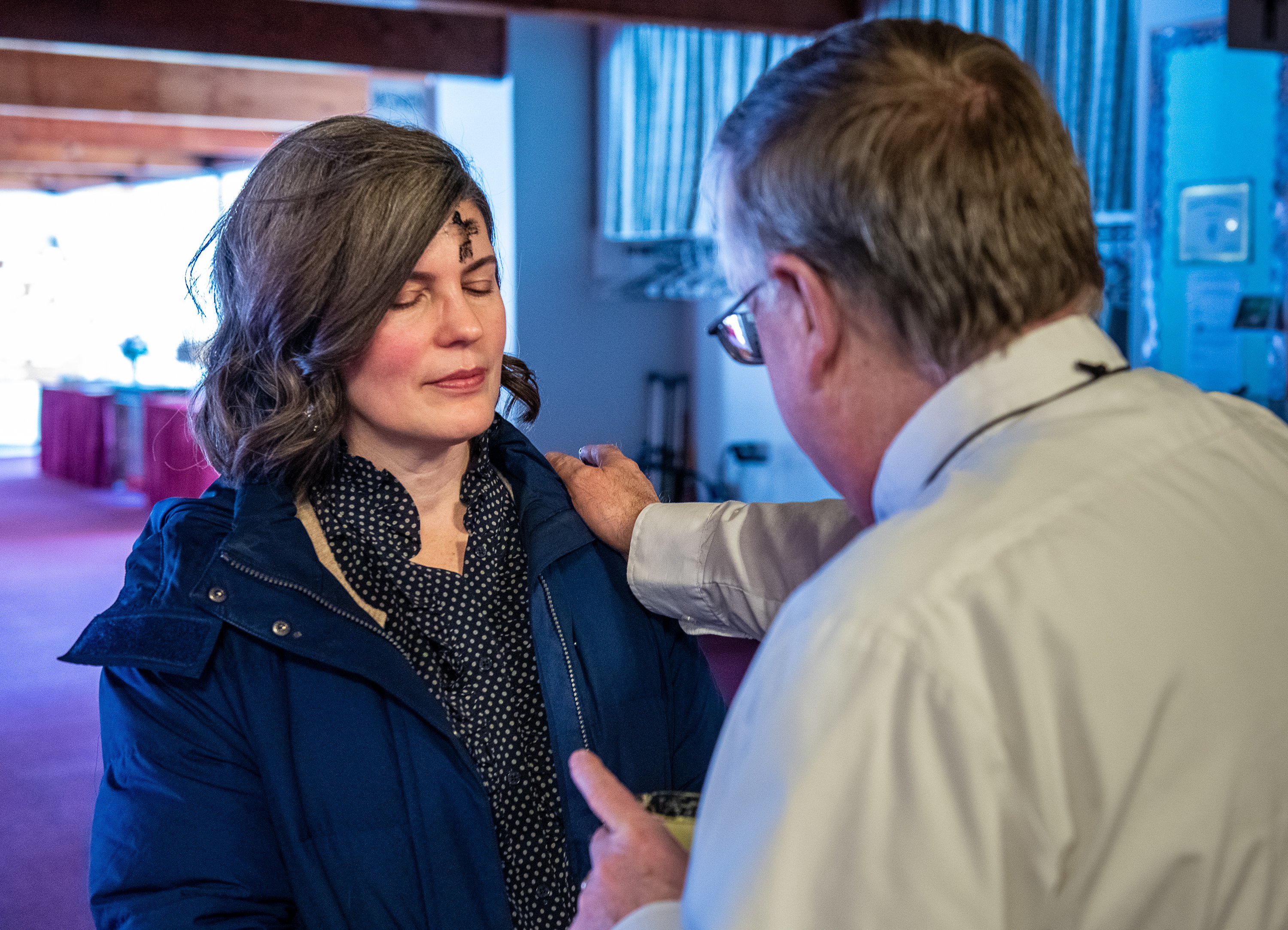 The Rev. Steve Bascom Sr., right, administers ashes to parishioner Donald Peck on Wednesday afternoon at the United Methodist Church of Auburn. “We do this to remind people of God’s grace and forgiveness and give them hope as they deepen their own faith journey,” Bascom said before anointing another member of his parish. The ashes are made from palm tree fronds from the previous year mixed with olive oil.The Rev. Steve Bascom Sr., right, prays with Hillory Oakes after administering ashes to her Wednesday afternoon at the United Methodist Church of Auburn.