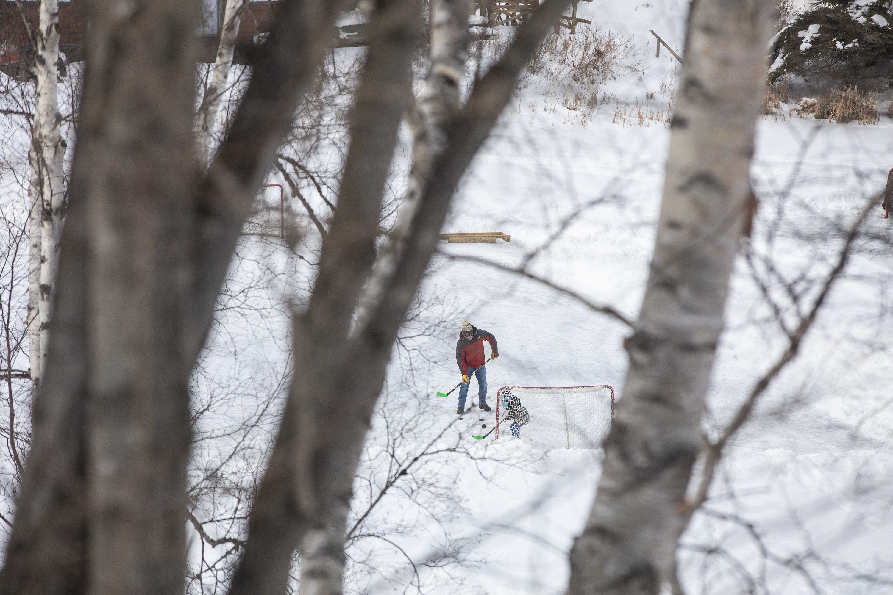 A man and a boy play hockey Feb. 7 on the public rink on Haley Pond in Rangeley. The pond is a popular spot for the sport, including the recent Rangeley Pond Hockey Festival that drew teams from around New England, Florida and Canada. (Rose Lincoln/Staff Writer)