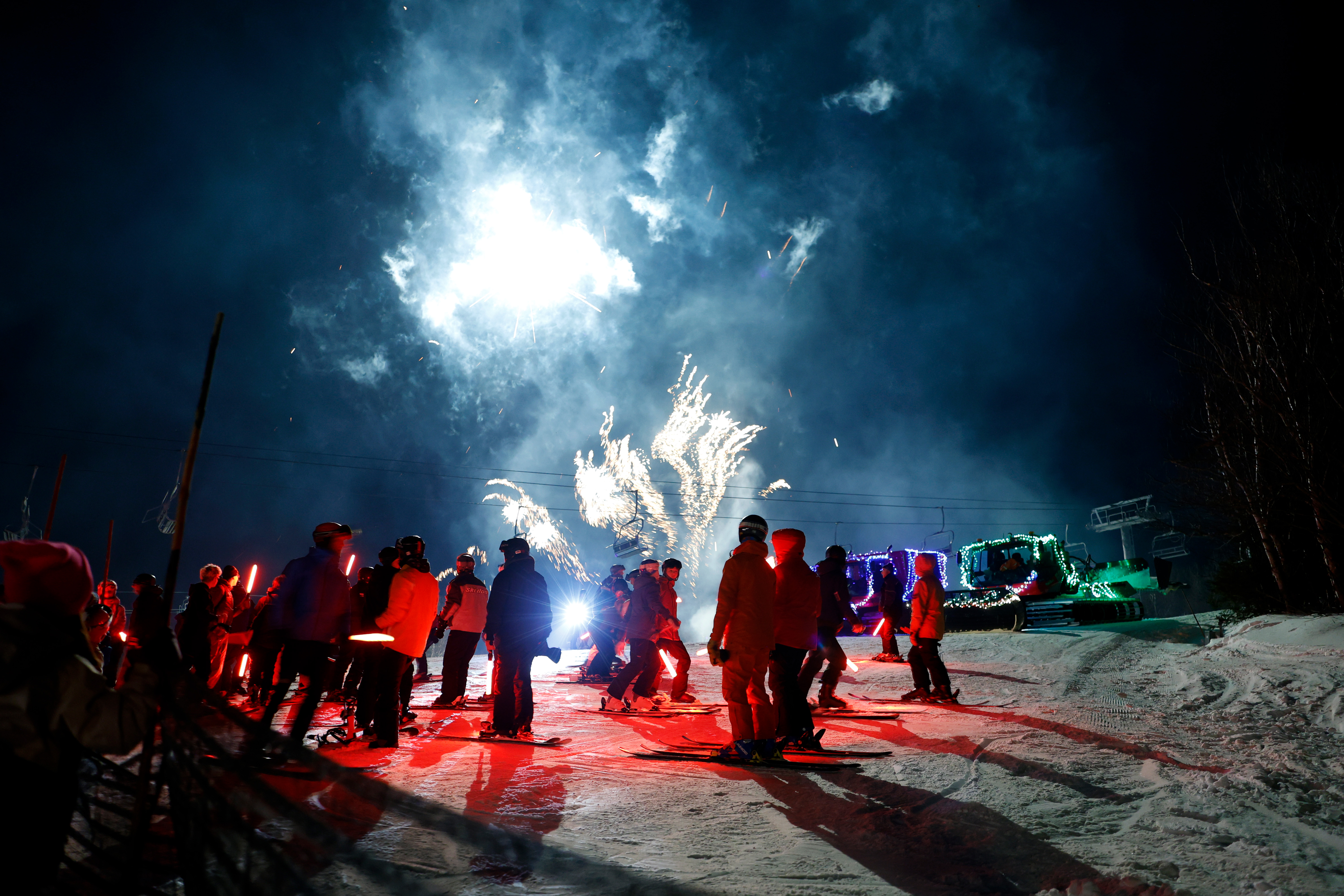 The topper for the evening was the torchlight parade, where guests and staff skied down Saddleback Mountain with bright red lights. At the end of the run, crowds cheered as the skiers regrouped at the lodge, and fireworks followed.