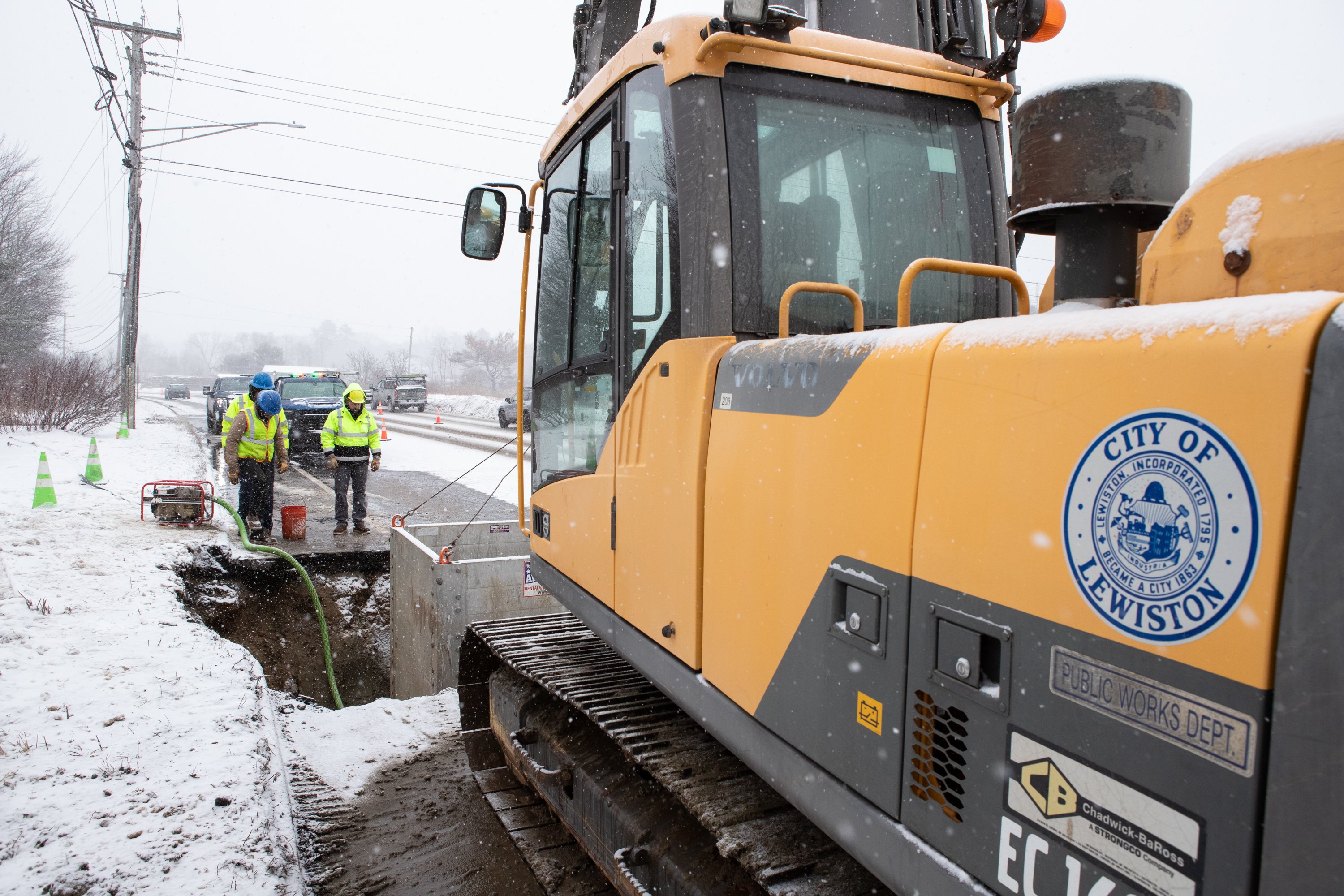 Lewiston Public Works repairs a water main break Wednesday on Lisbon Street near North Lisbon Road in Lewiston. Operations Manager Nate Landry, at right, said that they’d been working on the break since responding to the area at 6:15 Wednesday morning. It was repaired, and water service restored, later in the morning. (Libby Kamrowski Kenny/Staff Photographer)