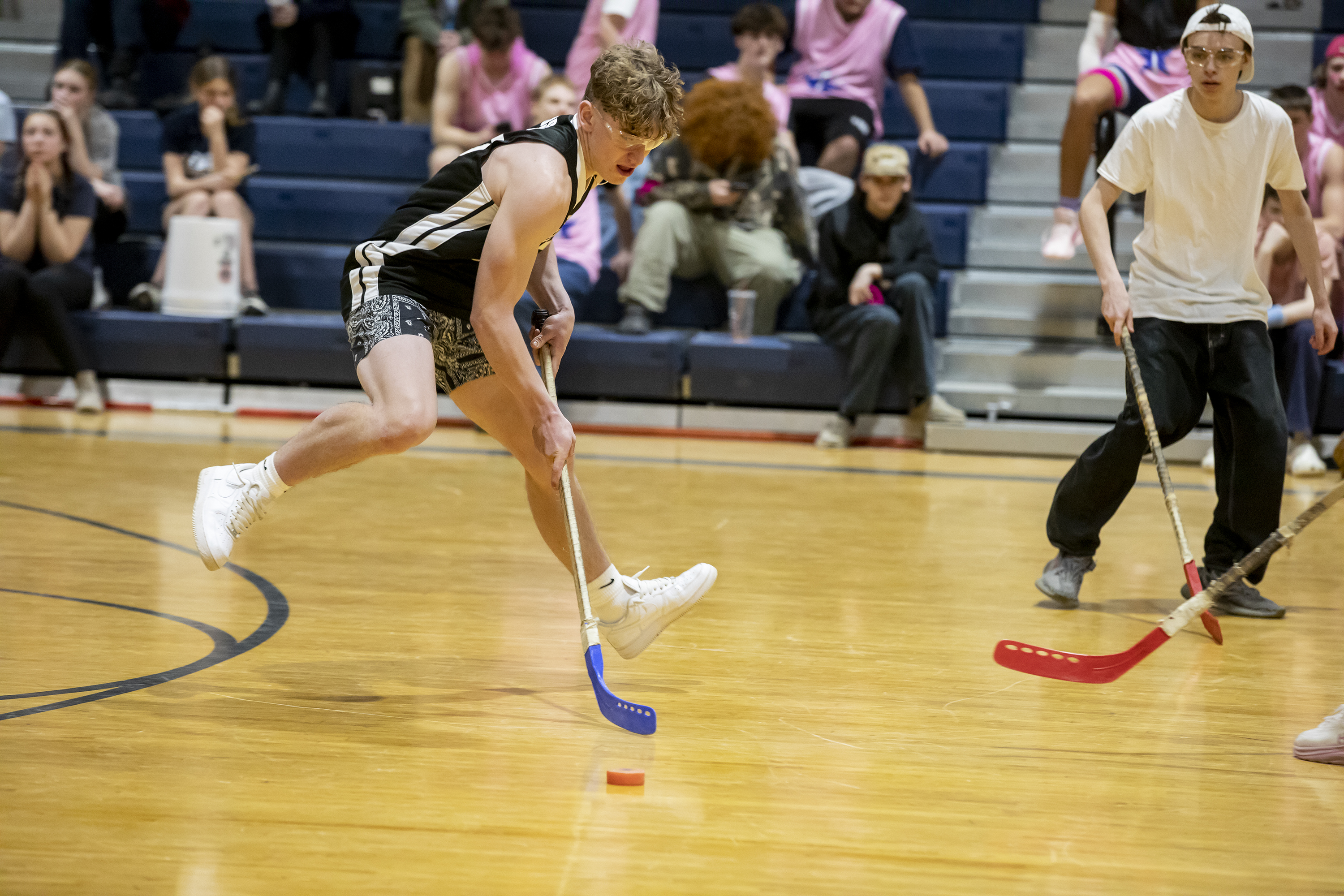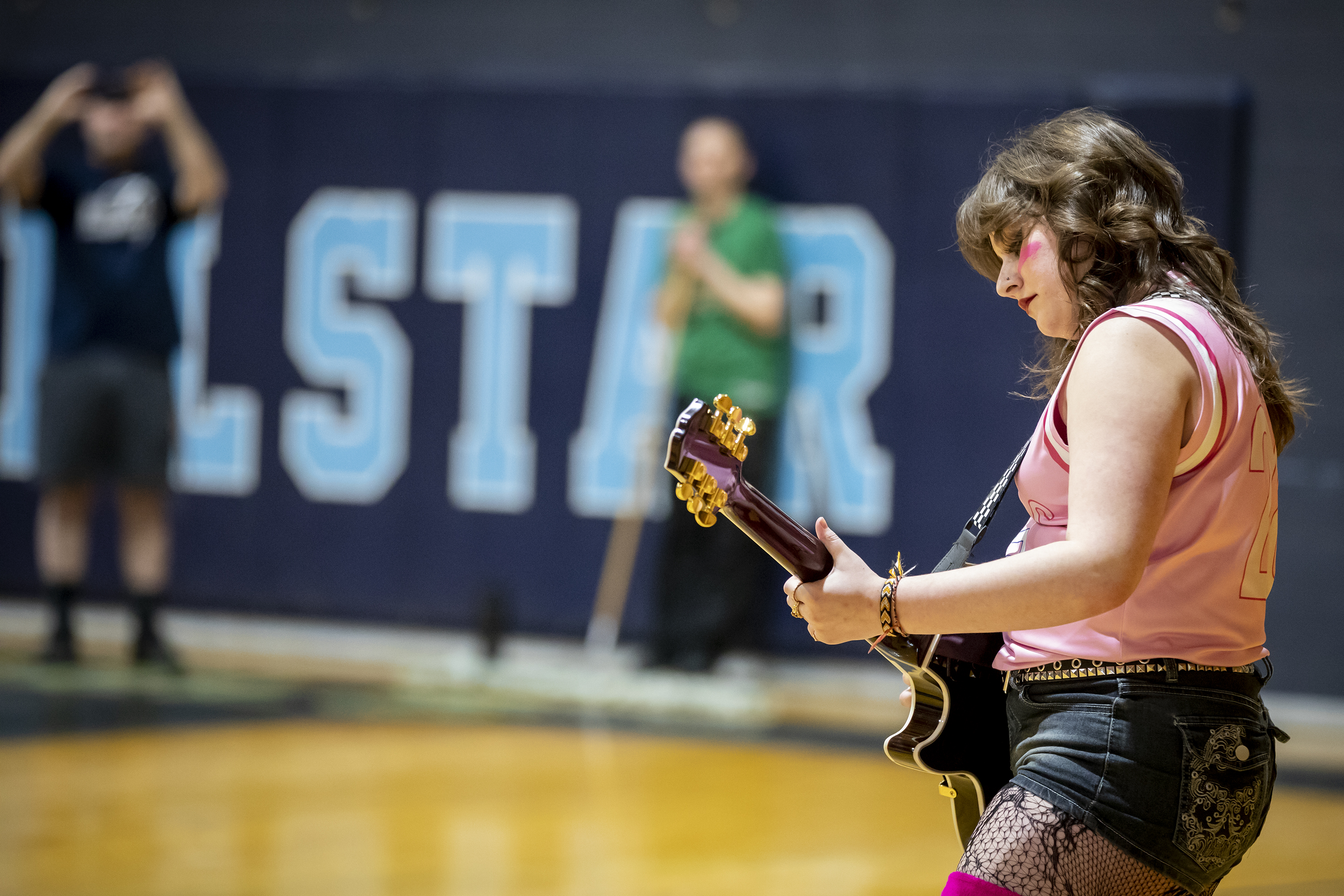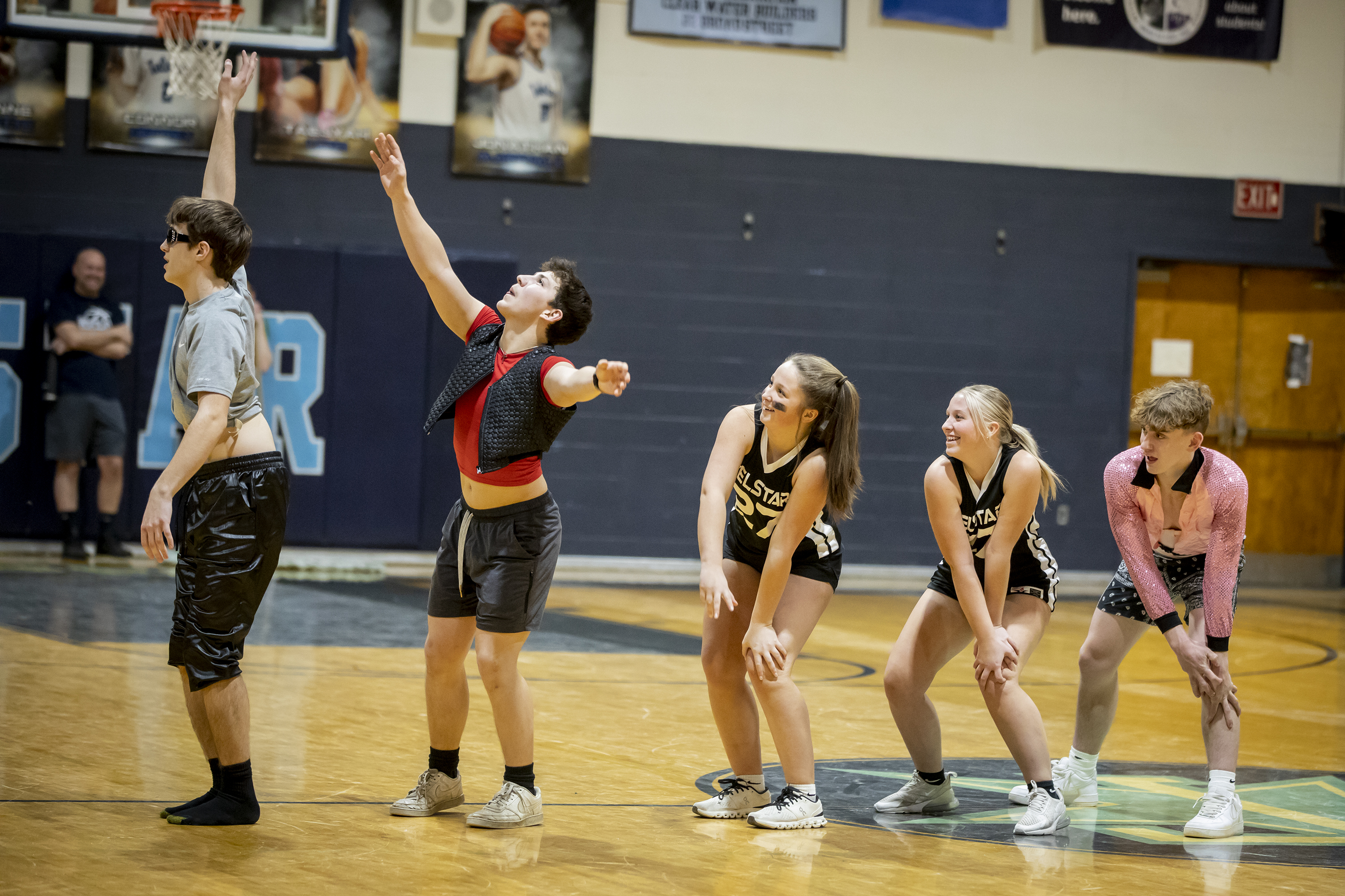 Telstar senior Tommy LaPointe ski jumps during the traditional annual carnival on Feb. 11. (Courtesy of Tera Ingraham)Telstar seniors Evan Parsons, from left, Joey Lauria and Reggie Billings, and others, celebrate victory Feb.13 during Telstar’s traditional winter carnival. (Rose Lincoln/Staff Writer)Telstar Sophomore Eva Garant rocks the electric guitar Feb.13 during Telstar’s traditional winter carnival. (Rose Lincoln/Staff Writer)Students sing Feb.13 along with Senior Melina Patten during Telstar’s traditional winter carnival. (Rose Lincoln/Staff Writer)Students hold up their cellphone lights Feb.13 in the dark gym while senior Michaela Mowery sings during Telstar’s annual winter carnival. (Rose Lincoln/Staff Writer)Telstar juniors Cameron Wright, from left, Brennan Walker, Maya Buck, Emma McPherson and Austin Mosher perform their dance Feb. 13 during Telstar’s Winter Carnival. (Rose Lincoln/Staff Writer)Austin Mosher brings the puck down the gym Feb.13 while he and his junior teammates work on winning the gym hockey tournament during Telstar’s winter carnival. (Rose Lincoln/Staff Writer)Telstar Math teacher Jonathan Erde gets ready to throw the basketball into the game Feb. 13 between students and staff. The sophomore team wears pink in the background. (Rose Lincoln/Staff Writer)Telstar students watch as freshman Aiden Paul ski jumps Feb. 11 during the annual winter carnival. (Courtesy of Tera Ingraham)