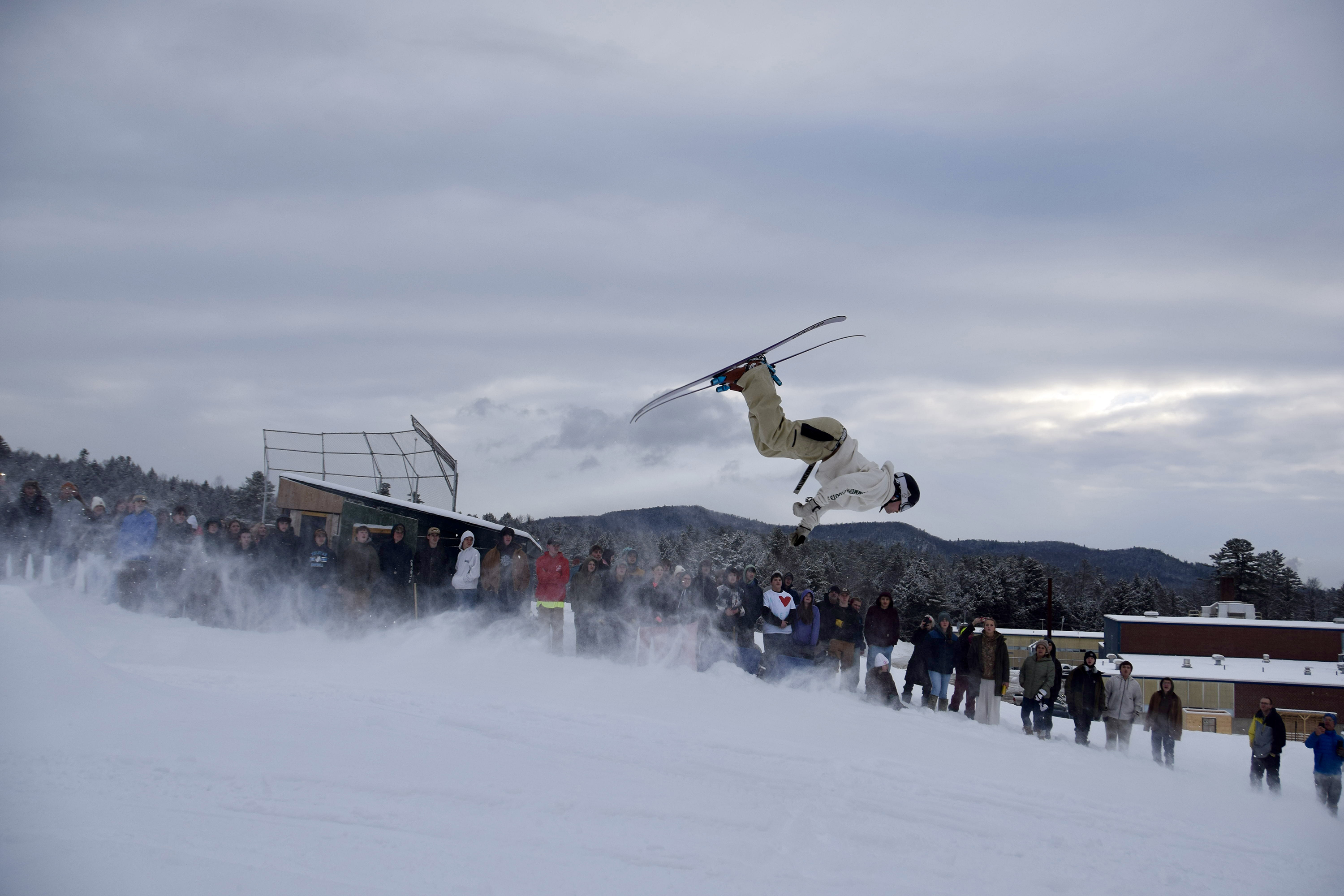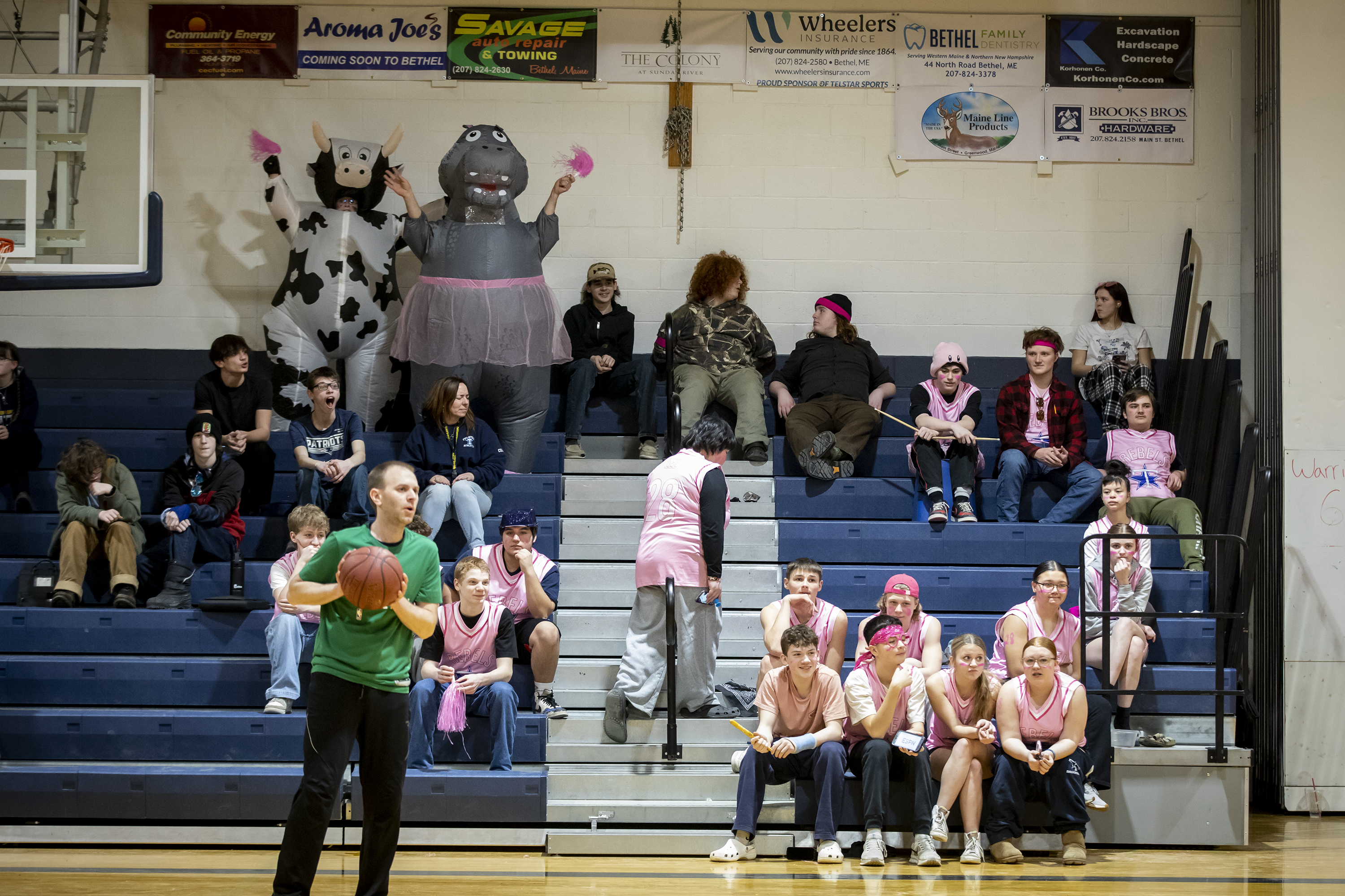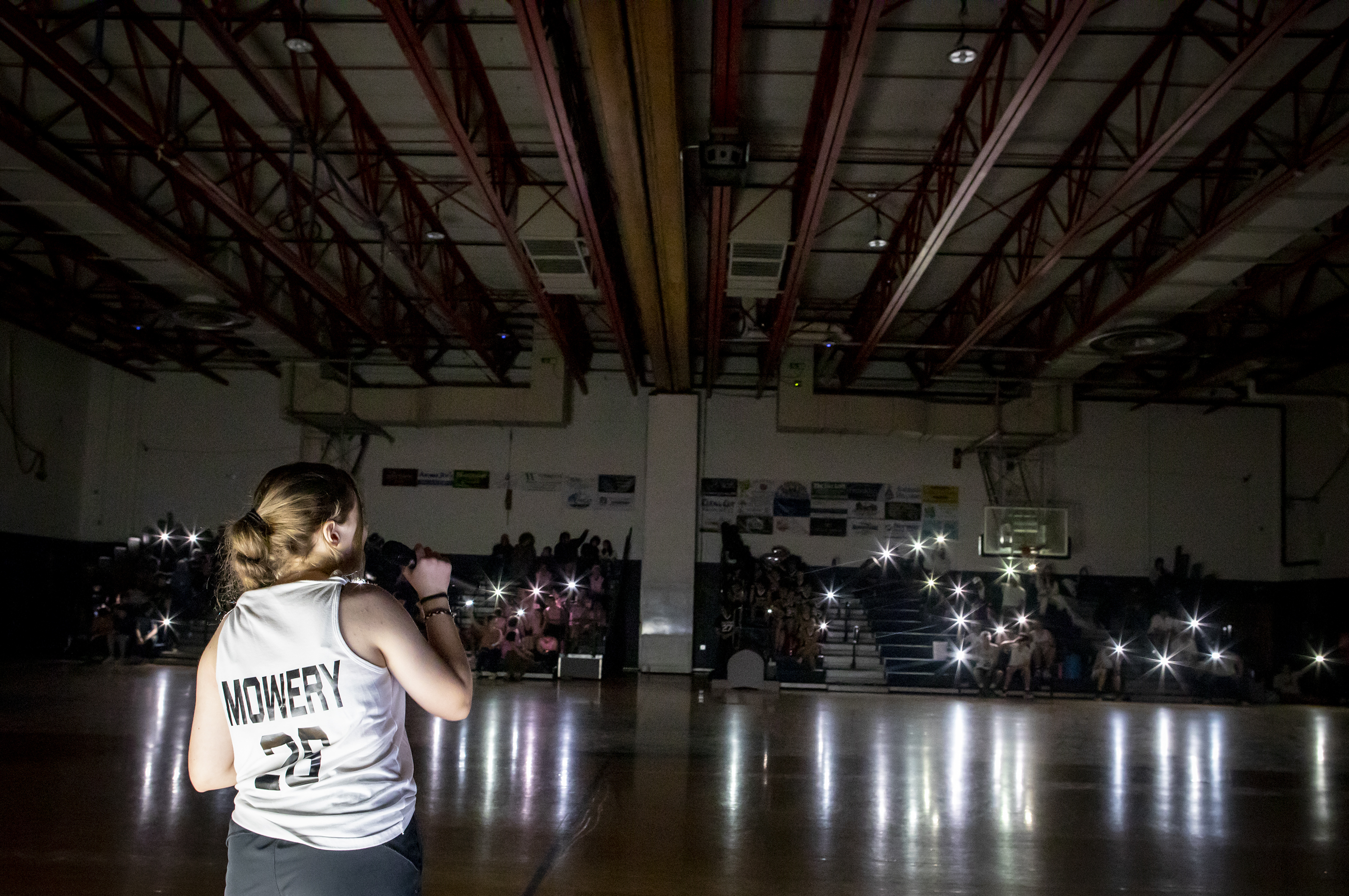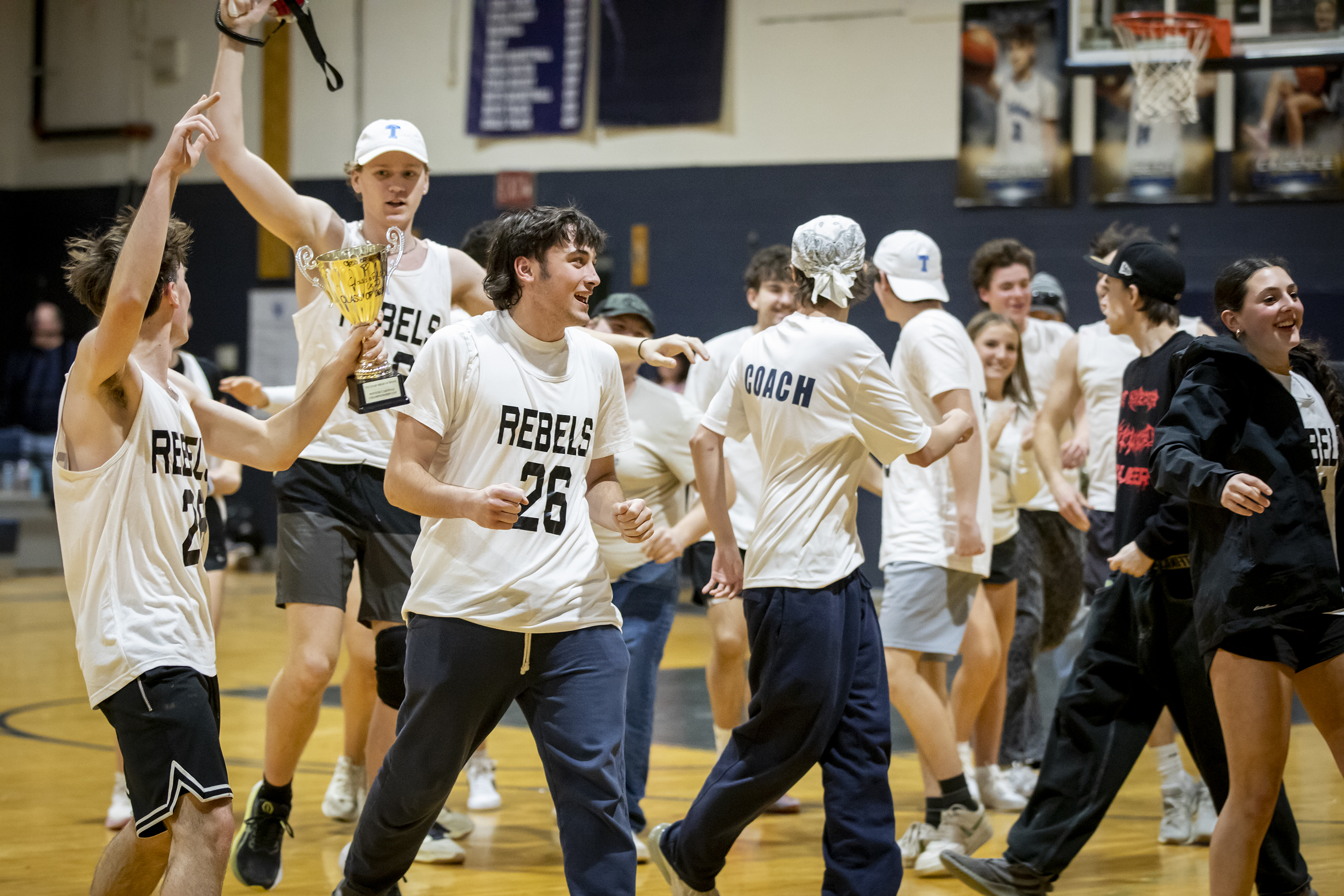 Telstar senior Tommy LaPointe ski jumps during the traditional annual carnival on Feb. 11. (Courtesy of Tera Ingraham)Telstar seniors Evan Parsons, from left, Joey Lauria and Reggie Billings, and others, celebrate victory Feb.13 during Telstar’s traditional winter carnival. (Rose Lincoln/Staff Writer)Telstar Sophomore Eva Garant rocks the electric guitar Feb.13 during Telstar’s traditional winter carnival. (Rose Lincoln/Staff Writer)Students sing Feb.13 along with Senior Melina Patten during Telstar’s traditional winter carnival. (Rose Lincoln/Staff Writer)Students hold up their cellphone lights Feb.13 in the dark gym while senior Michaela Mowery sings during Telstar’s annual winter carnival. (Rose Lincoln/Staff Writer)Telstar juniors Cameron Wright, from left, Brennan Walker, Maya Buck, Emma McPherson and Austin Mosher perform their dance Feb. 13 during Telstar’s Winter Carnival. (Rose Lincoln/Staff Writer)Austin Mosher brings the puck down the gym Feb.13 while he and his junior teammates work on winning the gym hockey tournament during Telstar’s winter carnival. (Rose Lincoln/Staff Writer)Telstar Math teacher Jonathan Erde gets ready to throw the basketball into the game Feb. 13 between students and staff. The sophomore team wears pink in the background. (Rose Lincoln/Staff Writer)Telstar students watch as freshman Aiden Paul ski jumps Feb. 11 during the annual winter carnival. (Courtesy of Tera Ingraham)