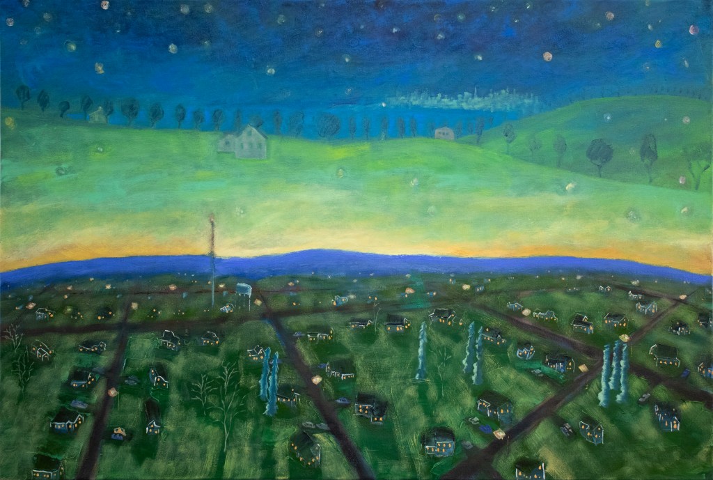 Bachelard’s assertion that “something closed” retains those memories is apparent in walls and fences of many paintings, or in the way a memory floats apart from the terrestrial reality of the neighborhoods Benfey depicts. The walls resemble the tall concrete barriers that run alongside highways, isolating and insulating suburban life from the rushing to and fro of commuters, commerce and travelers. Inside the wall life stands still. “Neighborhood, Edge of the Visible,” “House, Edge of the Visible,” “Winter Candle House” and “Purple Neighborhood with Decoration” all have this sense of boundary that forms the container of memory.