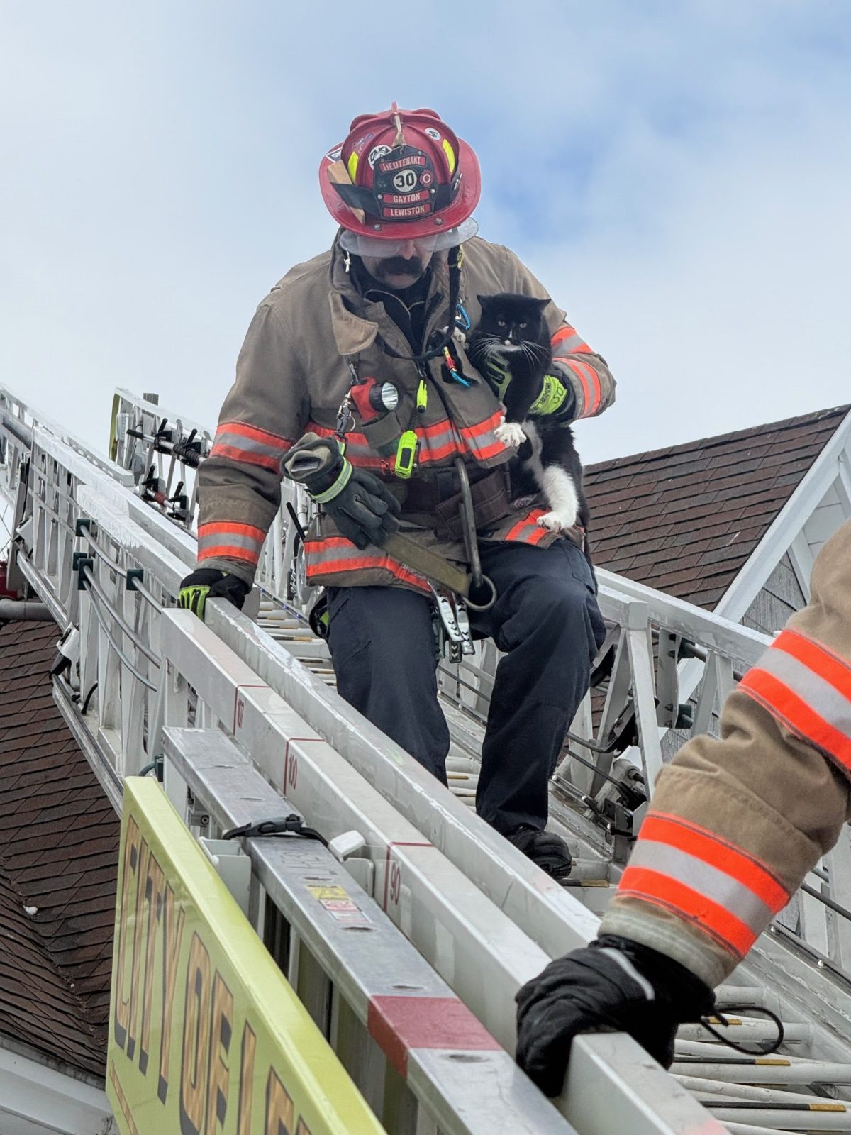 Lewiston’s Engine 3 crew was sent to 336 Bates St. at about 10:30 a.m. after the cat was spotted 40 feet up on the sharply steeped roof, either unwilling or unable to come down.