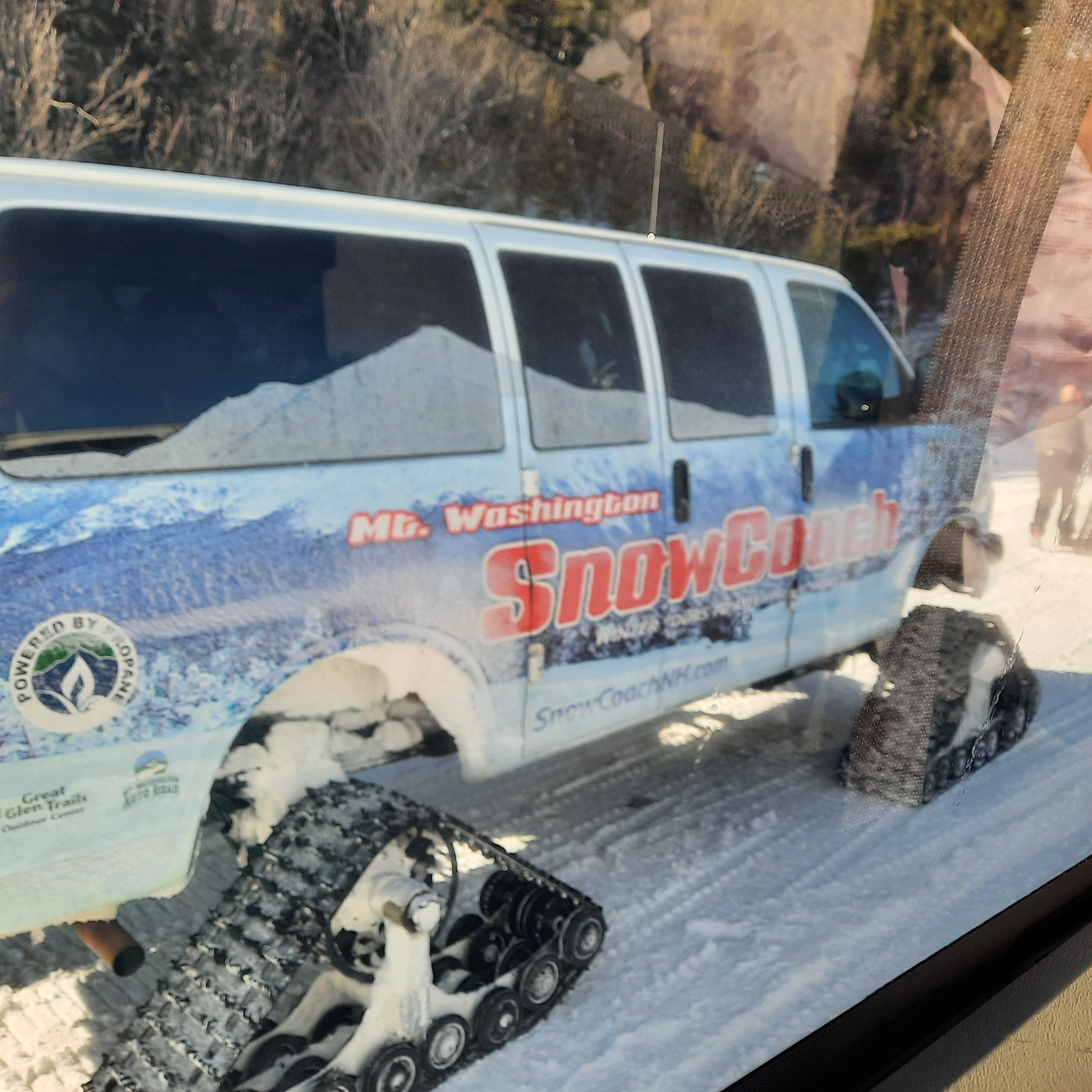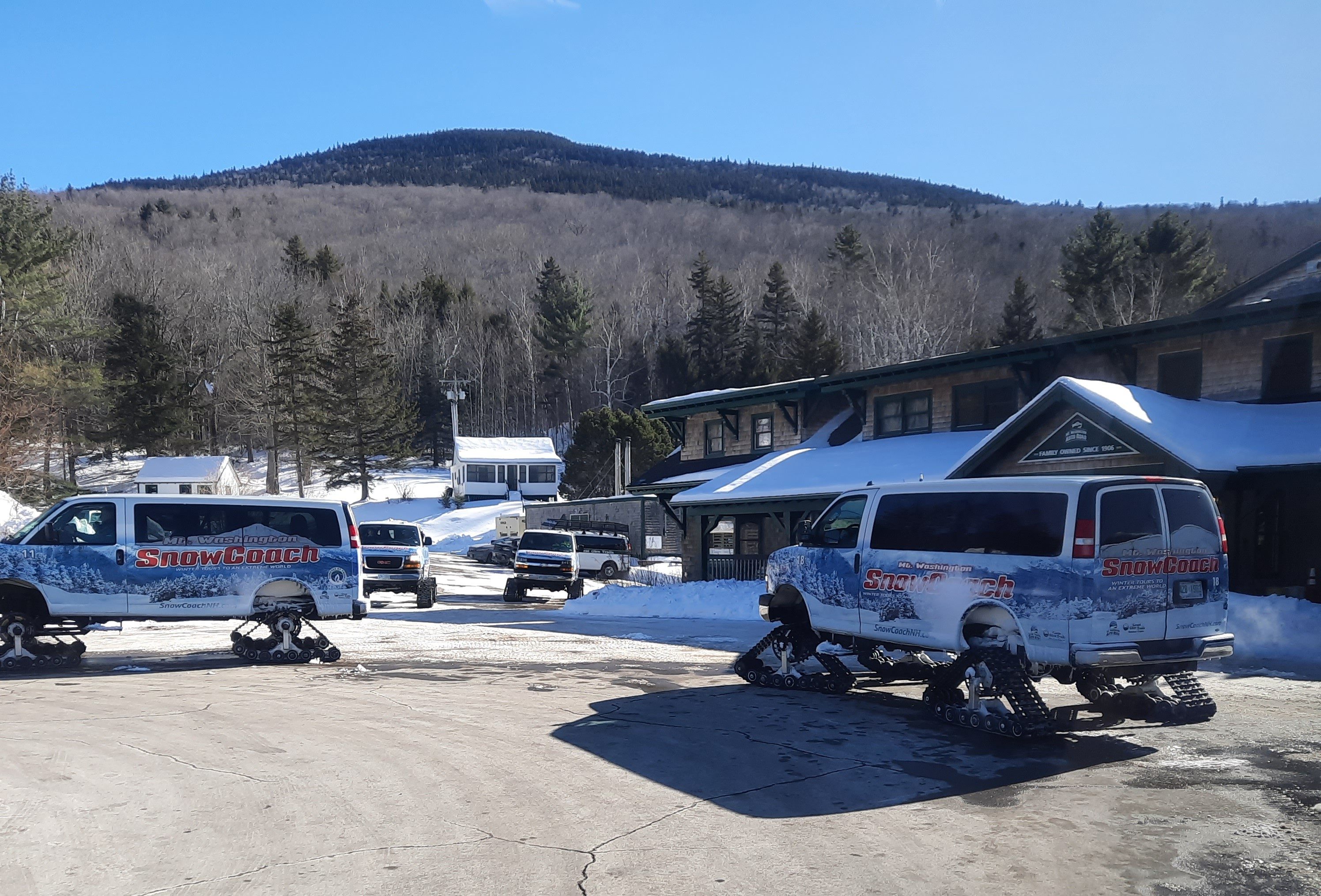 On the “bluebird day,” what mountaineers say is ideal high-elevation weather with exceptional visibility, passengers boarded tracked SnowCoach vehicles at the Great Glen Trails Outdoor Center at the base of the Mount Washington Auto Road, before crossing Route 16 and beginning the climb.
