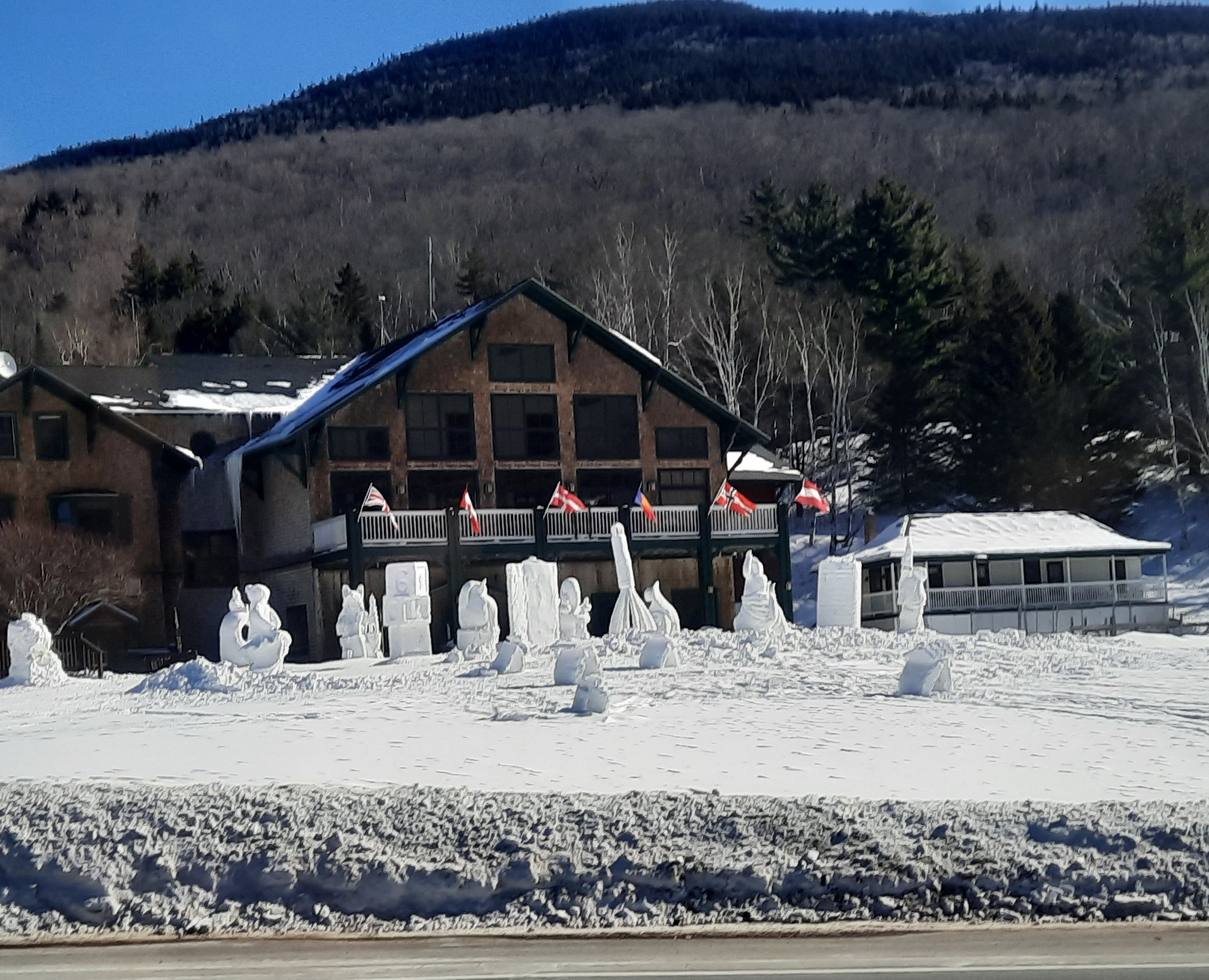 Snow sculptures on display Feb. 3 outside the Great Glen Trails Outdoor Center in Pinkham Notch, N.H., where visitors board Mount Washington Auto Road SnowCoaches. The sculptures were created during the New Hampshire Sanctioned & Jackson Invitational Snow Sculpting Competition, held Jan. 30 through Feb. 1. (Rebecca Richard/Staff writer)
