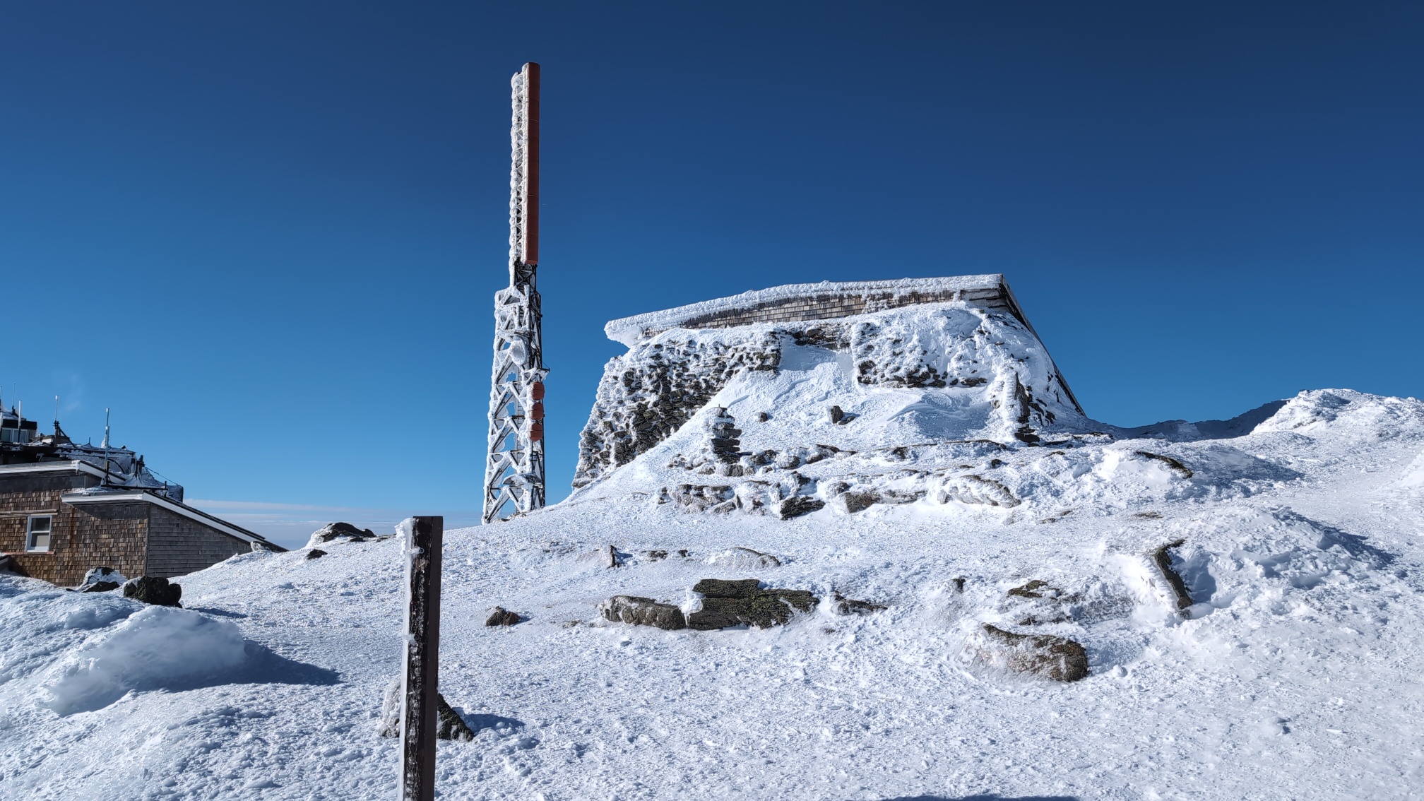 At the summit, the world looked almost entirely white. Structures and equipment were coated in thick layers of rime ice, frozen into sculpted shapes against a deep blue sky. Visitors stepped off the vehicle into bright sunlight and got in line at the iconic summit sign marking Mount Washington’s elevation.