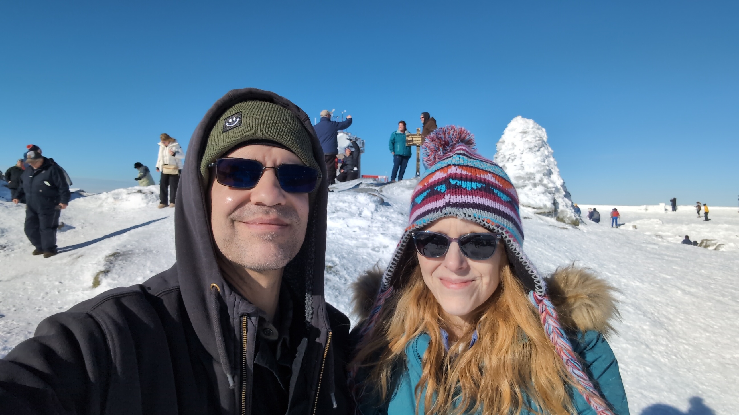Franklin Journal reporter Rebecca Richard and her husband, John, stand Feb. 3 near the summit of Mount Washington during rare calm winter conditions. Behind them, visitors gather at the summit sign and the rock cairn marking the 6,288-foot peak, completely encased in thick rime ice under clear blue skies. (Rebecca Richard/Staff writer)