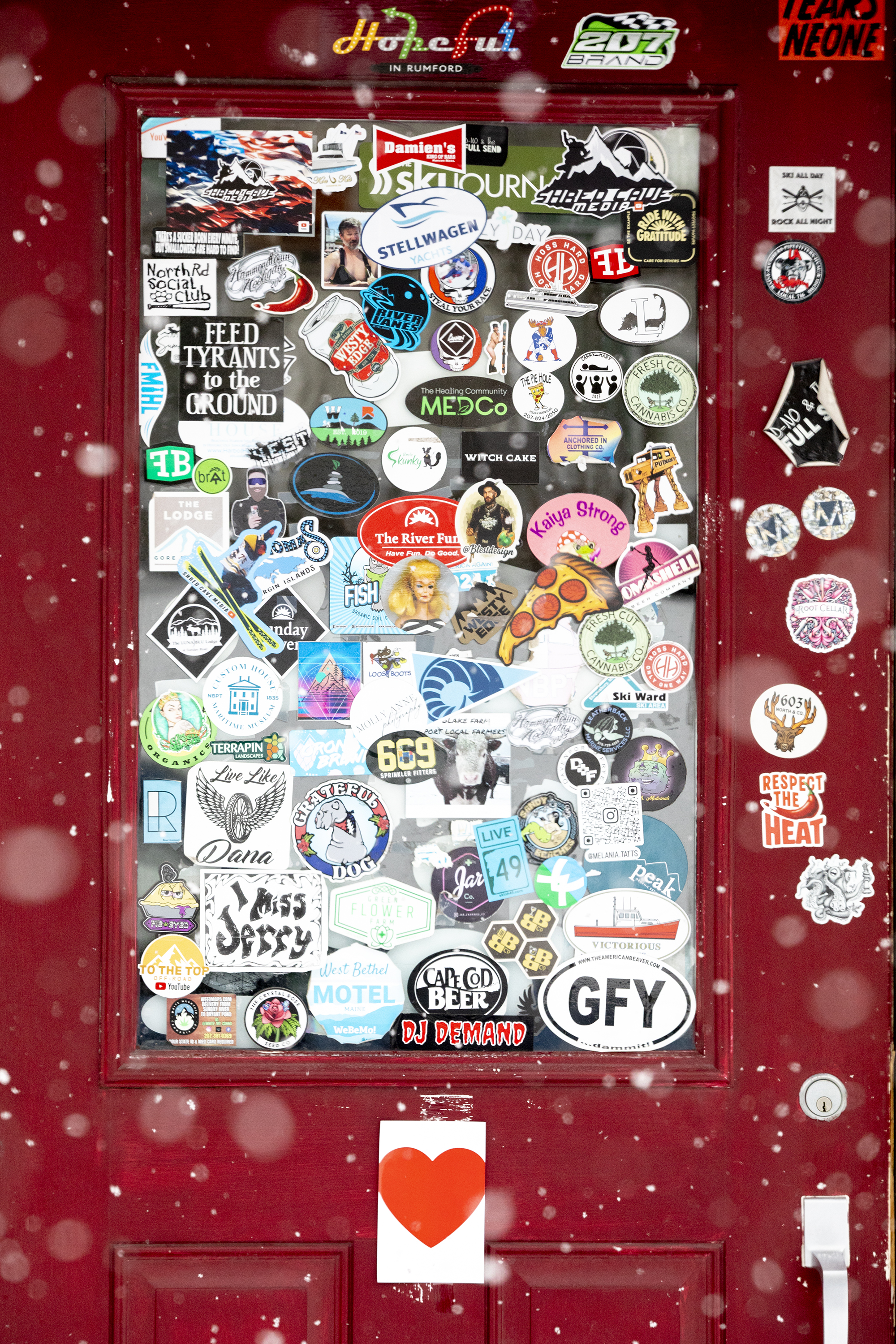 The door of the Suds Pub, a basement bar inside Bethel’s Sudbury Inn, is a mosaic of collected moments.