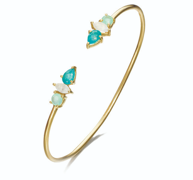 A perfect wedding party gal gift. Called “Bella,” this whimsical piece sets chalcedony and moonstone in solitaire, marquis and pear shapes on an 18K gold vermeil open bangle.