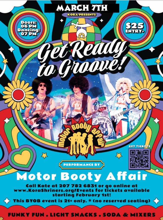 LEWISTON — On Saturday, March 7, at the Kora Temple, get funky, get down and get ready to dance to Motor Booty Affair starting at 7 p.m.