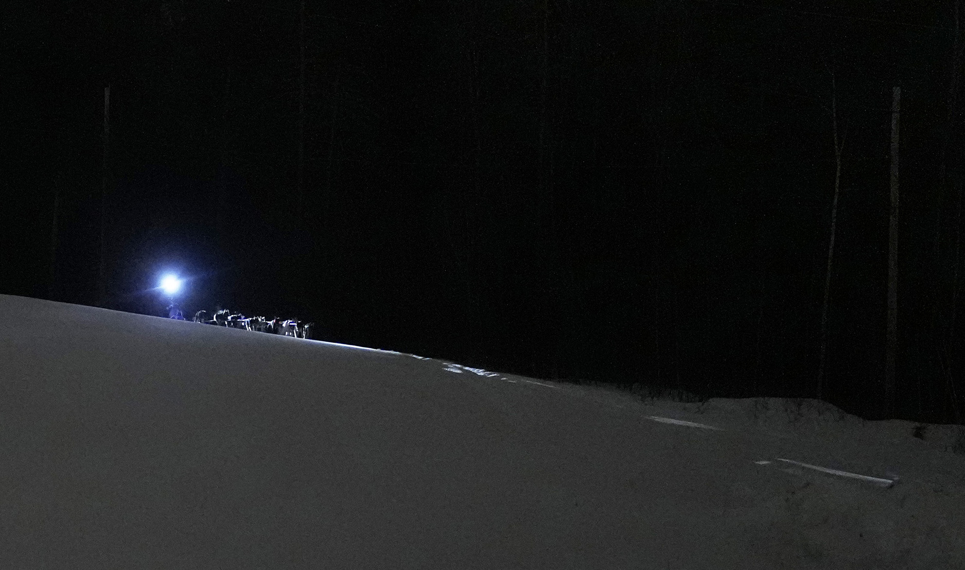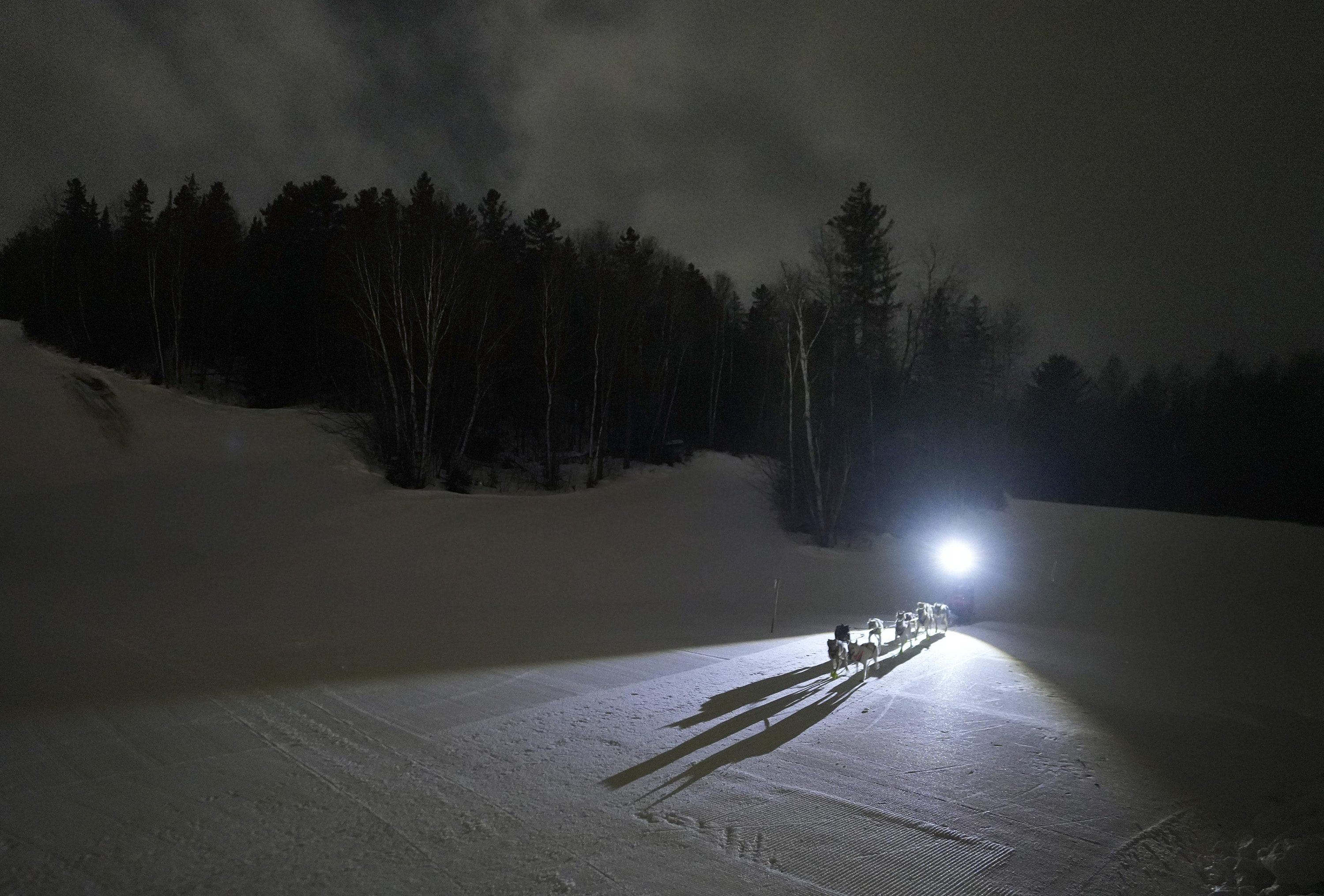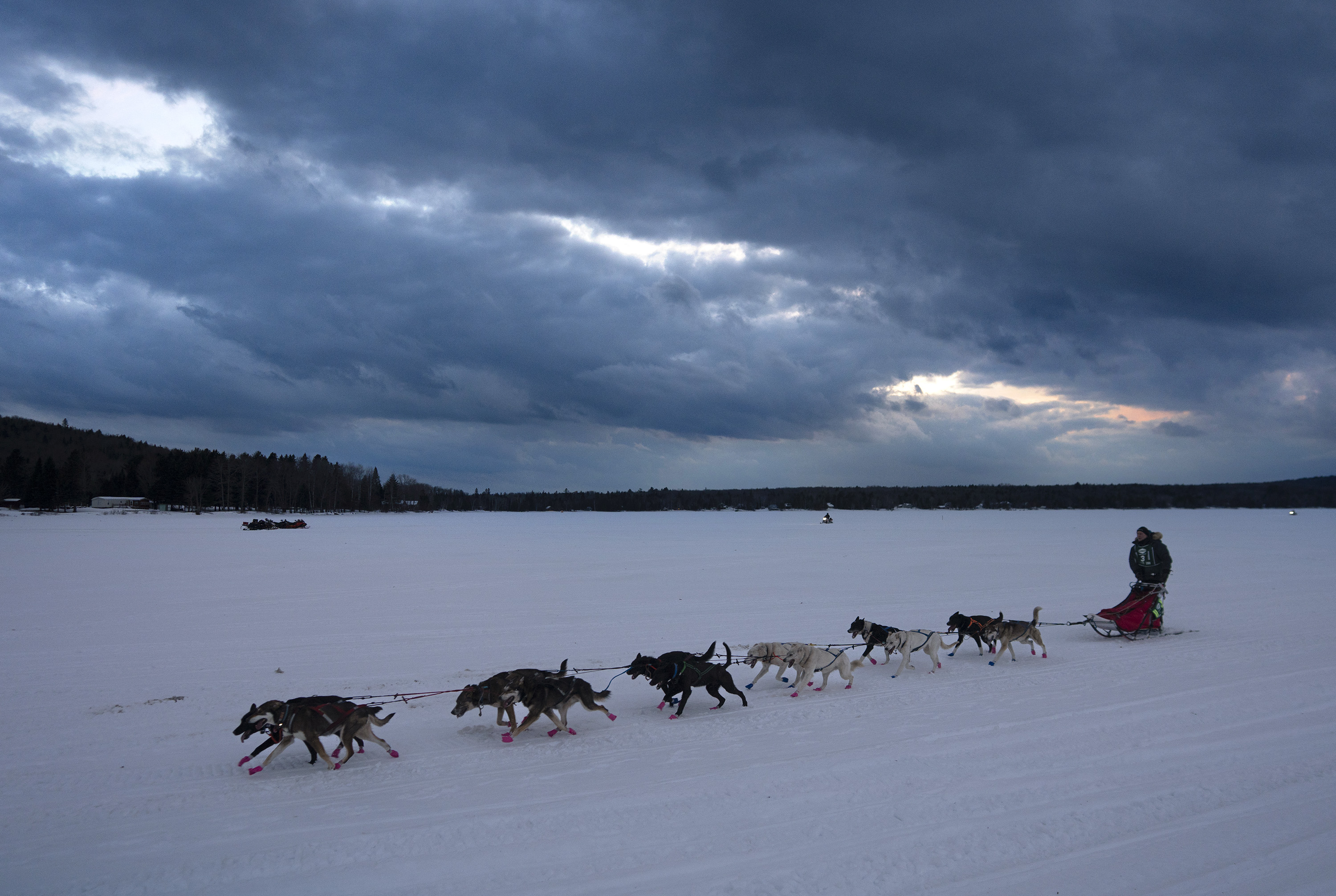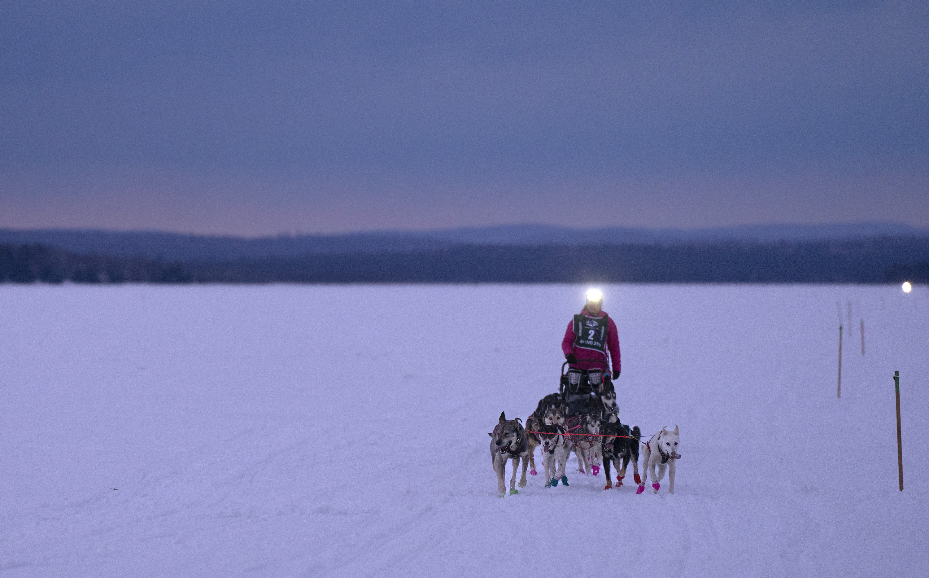 Martin Massicotte crosses Portage Lake at dusk on Saturday during the 250-mile race of the Can-Am Crown International Sled Dog Races. (Gregory Rec/Staff Photographer)