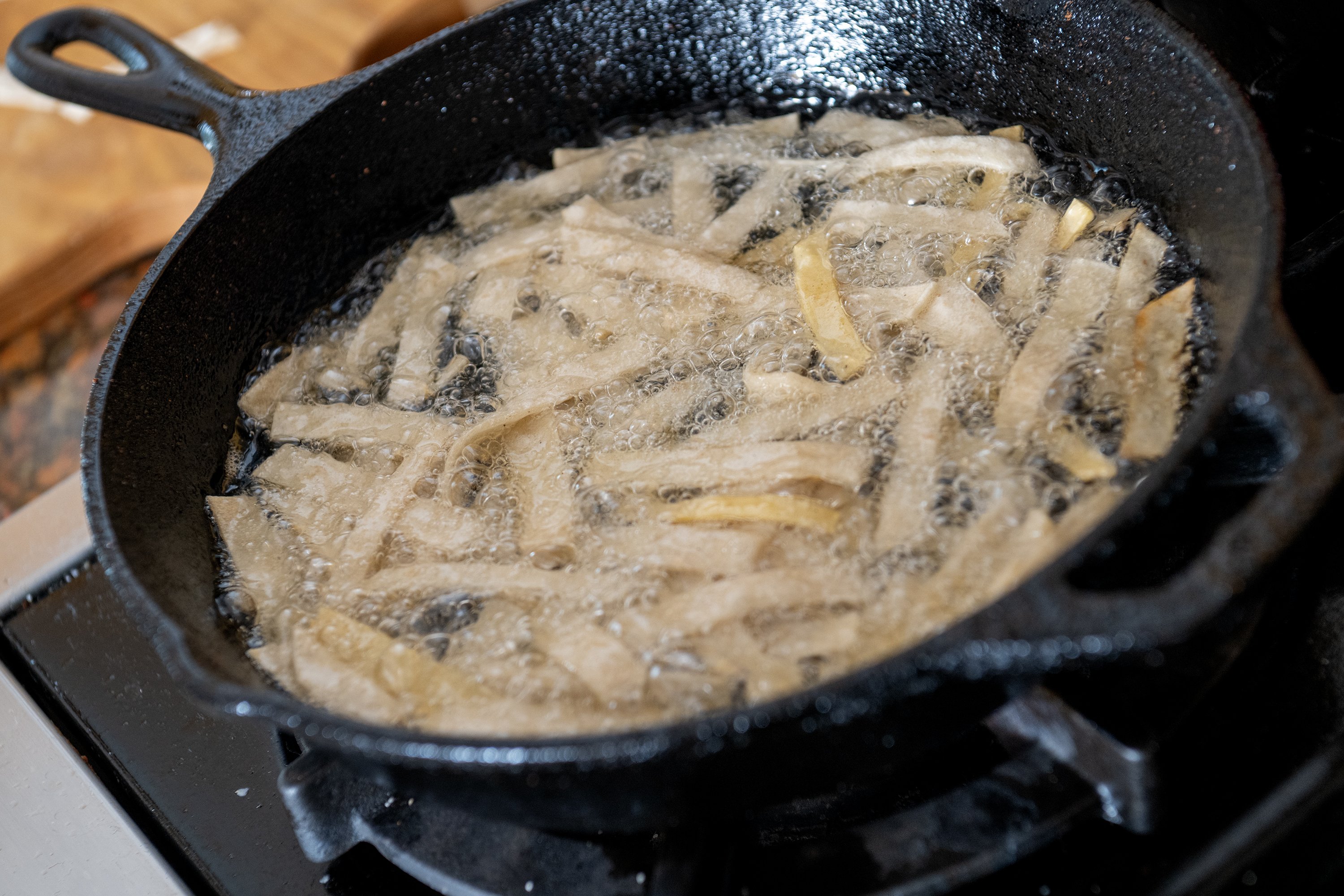 Pour 1/2 inch of vegetable oil into an 8-inch cast iron skillet. Smooth out a paper bag on the counter for draining.