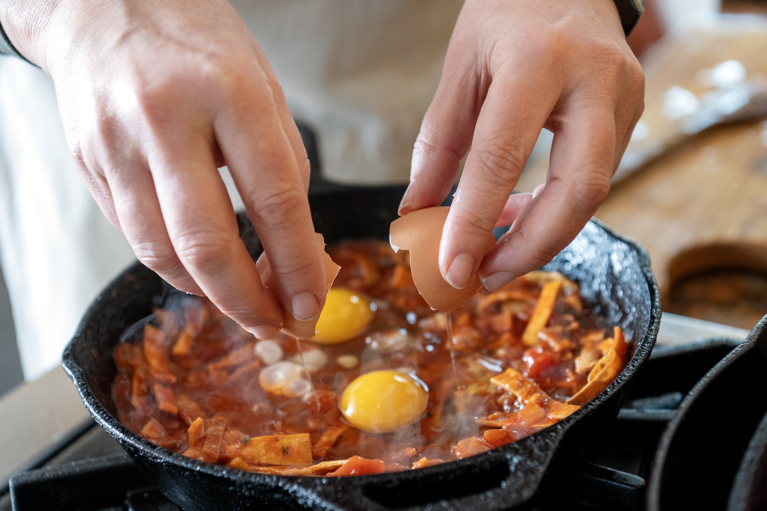 This is a traditional Mexican breakfast that makes use of stale corn tortillas. It’s often served with fried eggs, but these ones are poached in the same pan for easy cleanup.