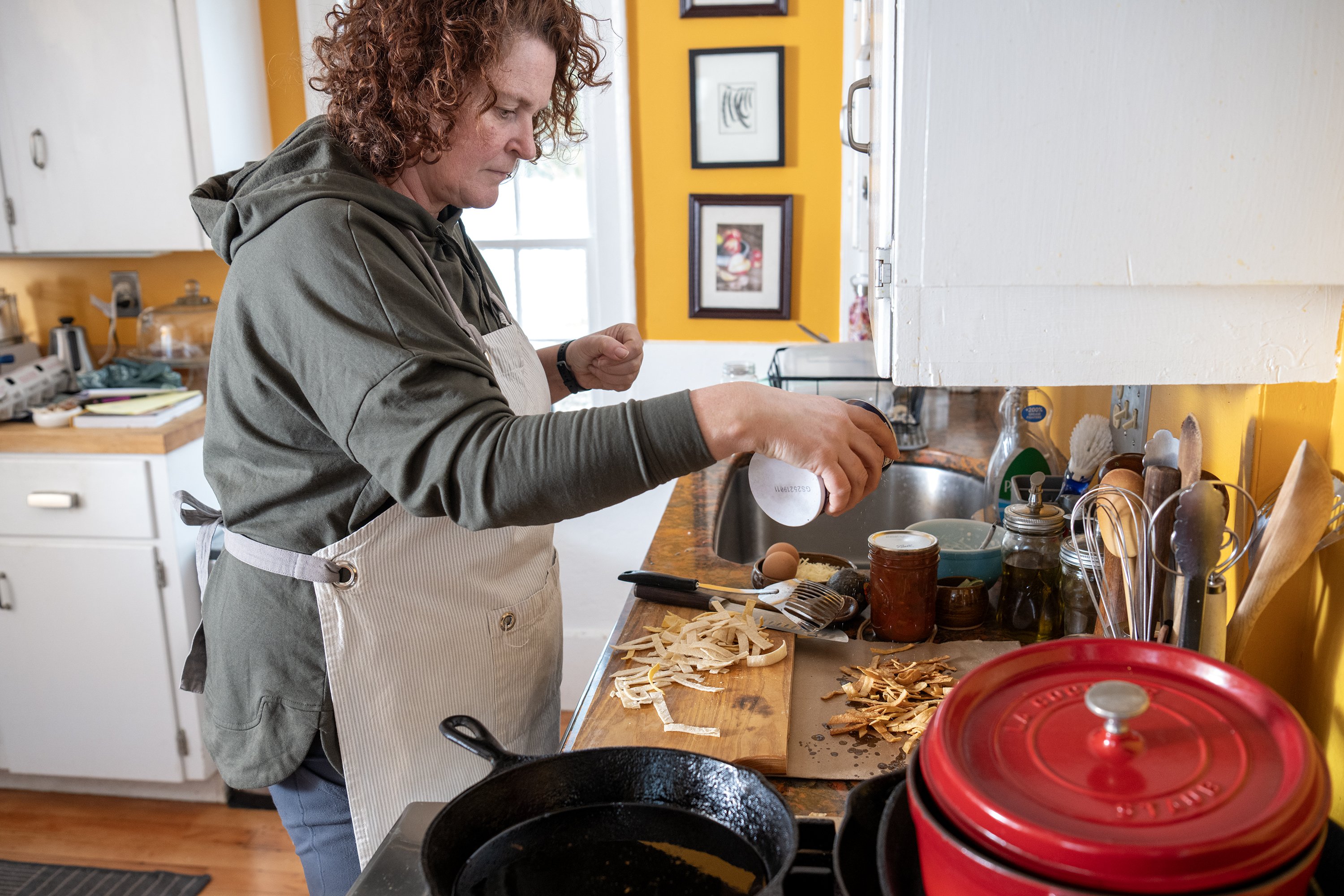 Then my crafty food friends descended on Maine for our annual mud season knitting weekend. On Sunday morning, we realized we’d not yet consumed the smoky salsa cookbook author Cathy Barrow had to check a bag to bring on her flight up from Washington, D.C.