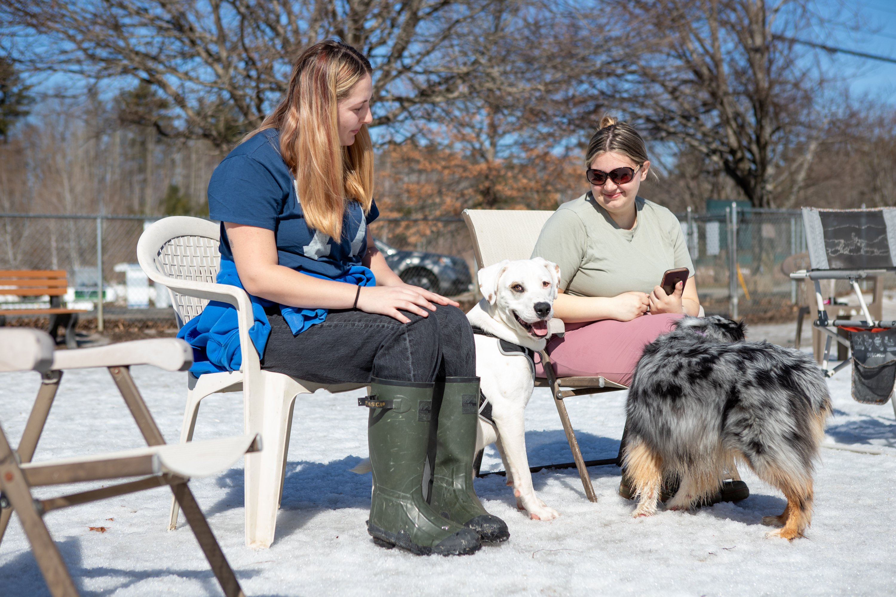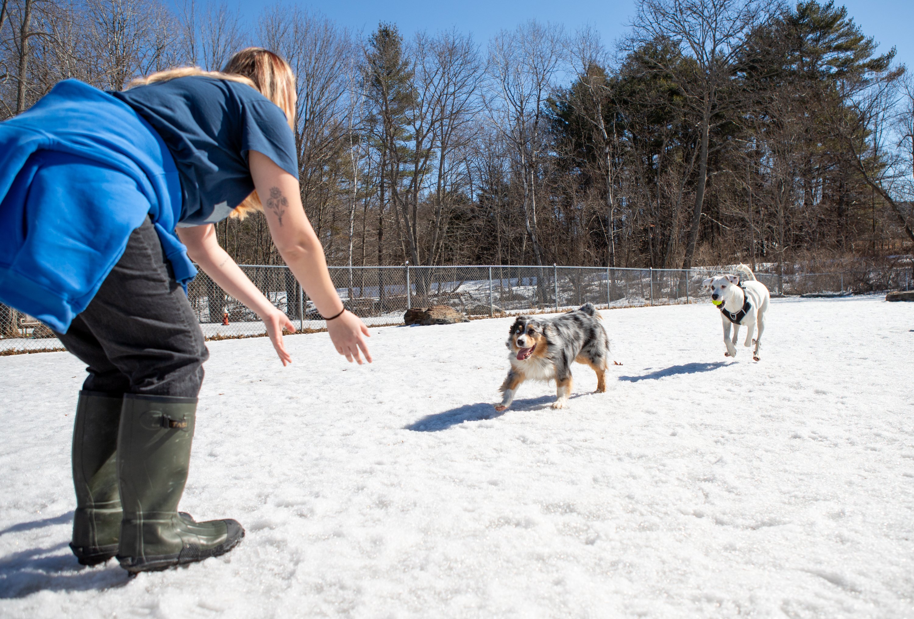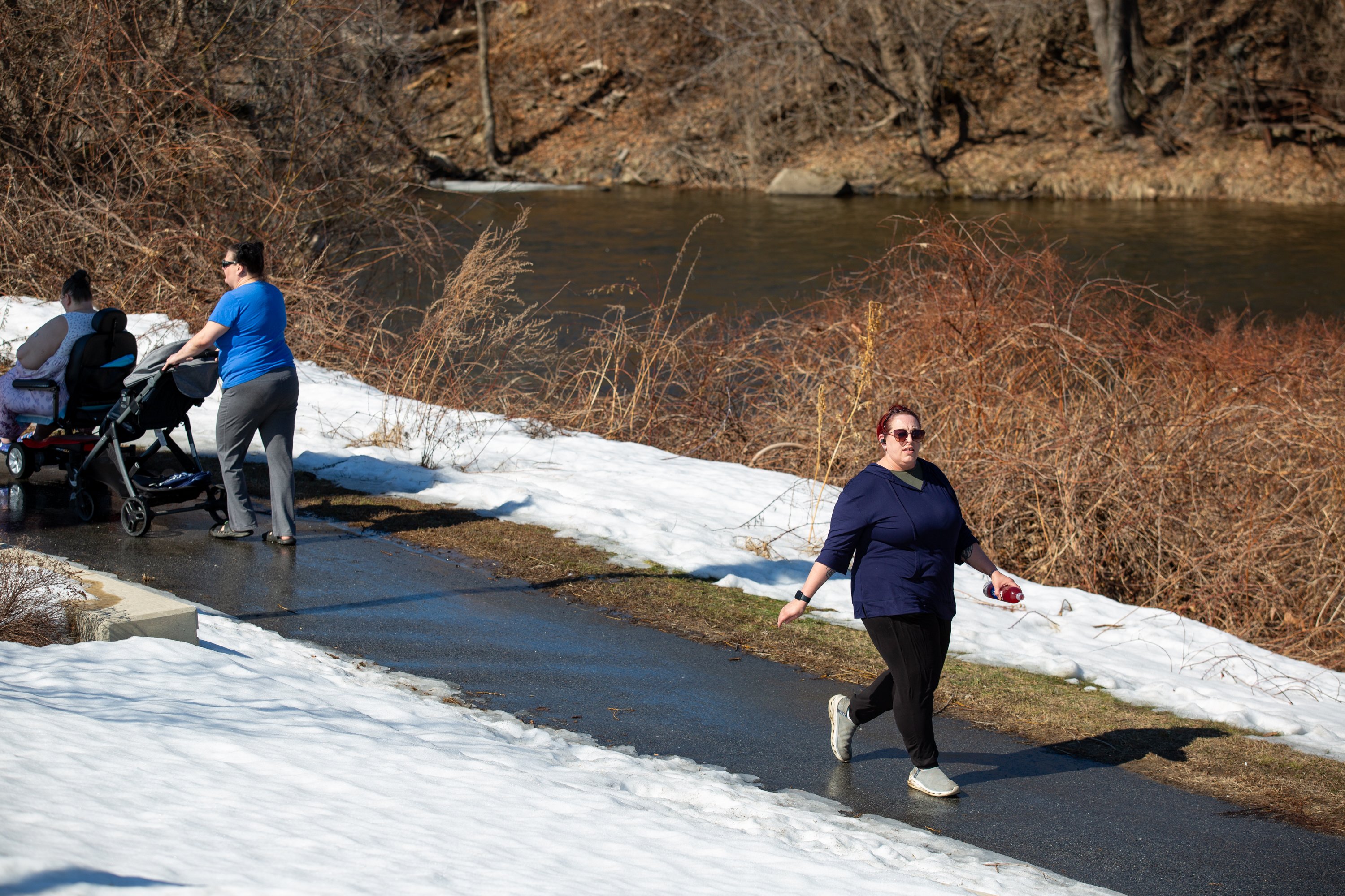 Makayla Estes plays with dogs Lucia, left, and Lucky during unseasonably warm weather Tuesday at Robin’s Garden and Dog Park in Lewiston. The weather is expected to be short-lasted, transitioning to rainy conditions for the next few days.Makayla Estes plays with dogs Lucia, center, and Lucky during unseasonably warm weather Tuesday at Robin’s Garden and Dog Park in Lewiston. The weather is expected to be short-lasted, transitioning to rainy conditions for the next few days. Makayla Estes, left, and Mackenzie Fecteau enjoy the unseasonably warm weather on Tuesday with dogs Lucky, center, and Lucia at Robin’s Garden and Dog Park in Lewiston. The weather is expected to be short-lasted, transitioning to rainy conditions for the next few days.Crystal Raucci-Robert takes laps around Sullivan Square and the waterfront trail on Tuesday in New Auburn. Raucci-Robert said she likes to get a walk in before work, and the weather was perfect for it Tuesday. “It’s like hashtag spring,” she said and laughed.Two women walk across the Bernard Lown Peace Bridge with a stroller containing a young child during unseasonably warm weather Tuesday in New Auburn.