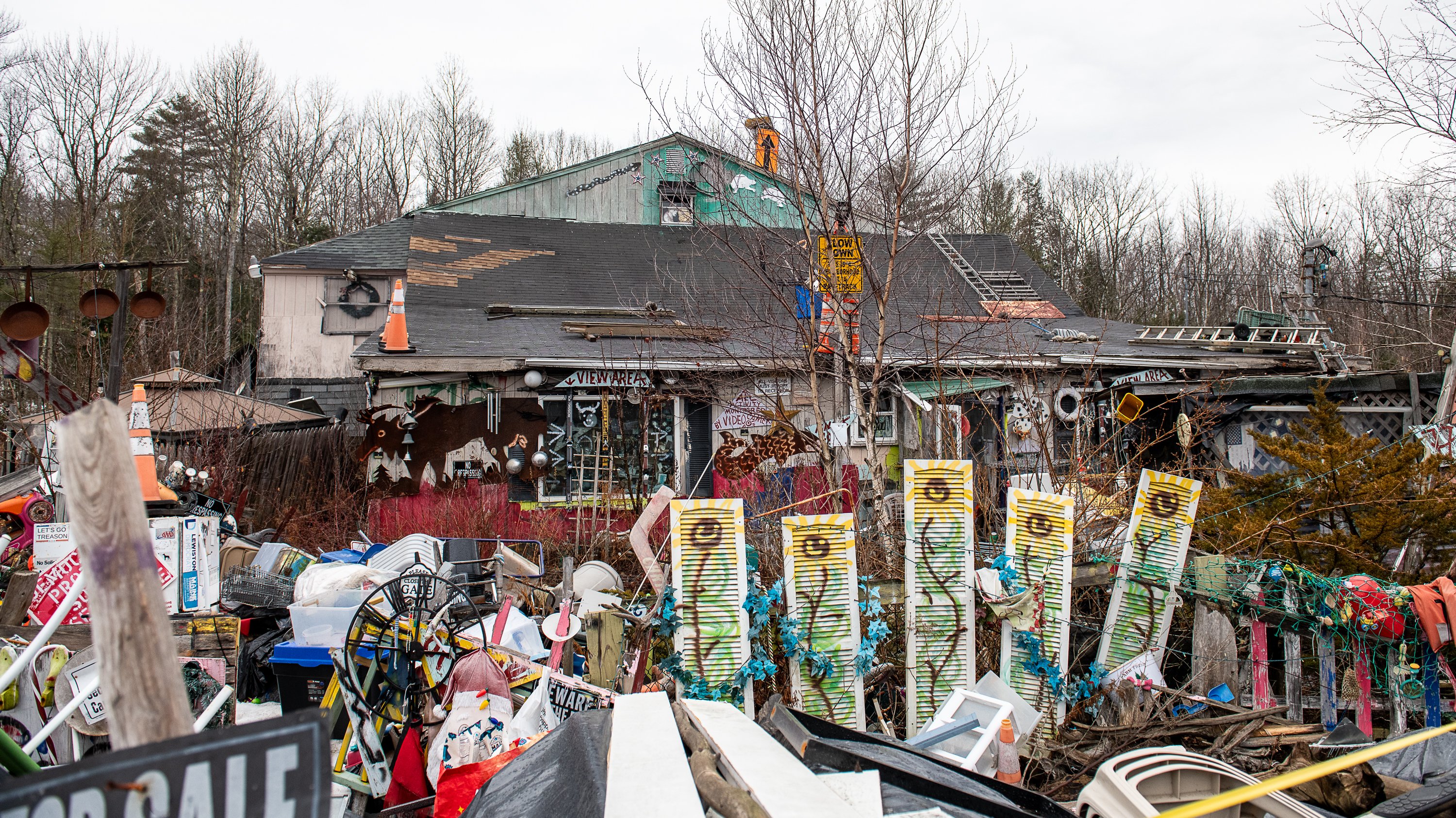 There are still massive mountains of random stuff sprawling in front of the rambling house. There are still arrays of hand-painted signs warning people off the property or protesting political matters.