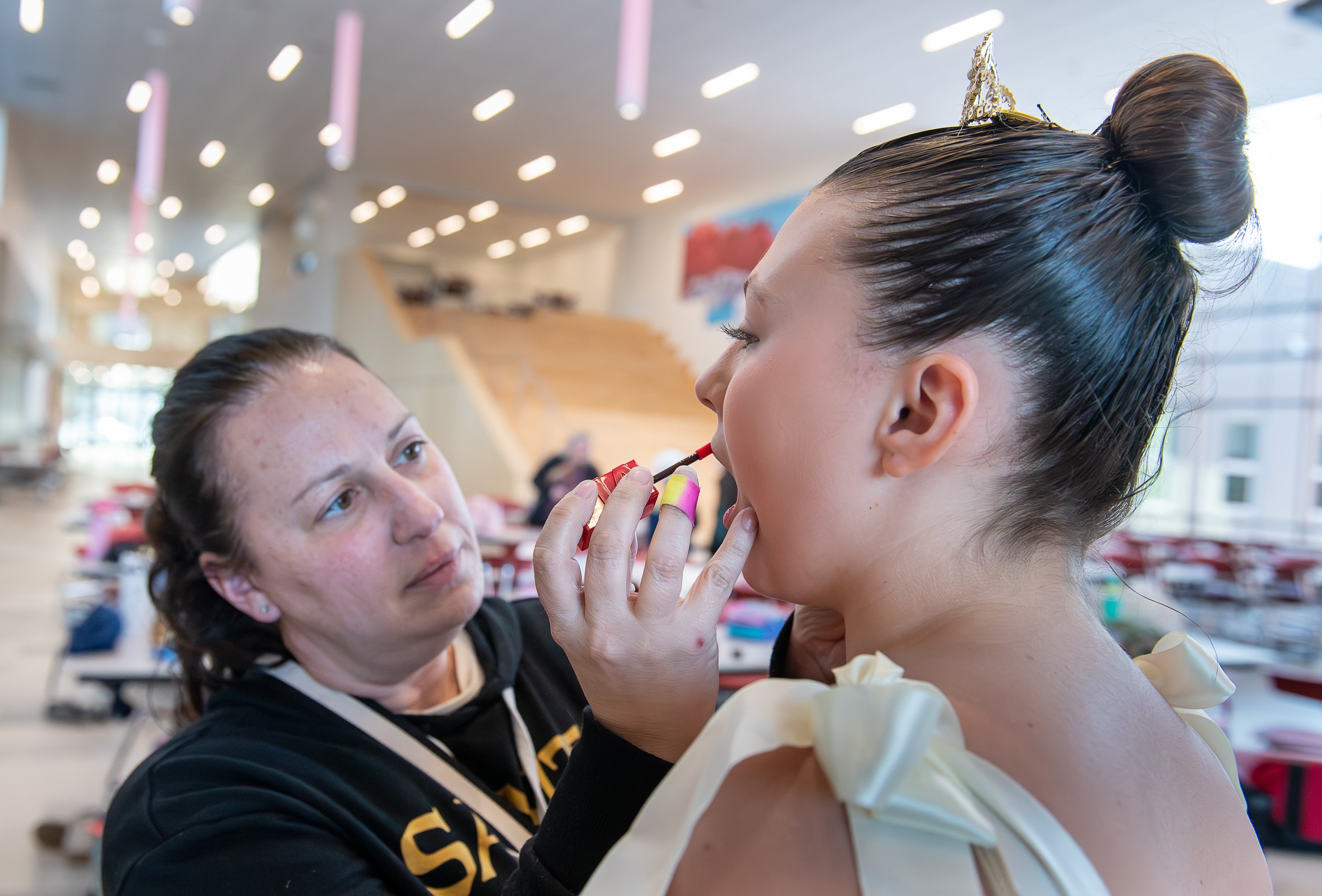 Purchase this imageAUBURN, March 25, 2026 – Ashley Smith applys lipstick to her daughter, Hayden prior to Wednesday night’s dress rehearsal for this weekend’s performance of an adaptation of the classic story of Cinderella created and performed by Ballet LA from the Dance Center in Auburn. Performances will take place Friday at 7PM and Saturday at 1 & 7PM at the Donald M. Gay Performing Arts Center at Edward Little High School in Auburn. (Russ Dillingham/Staff Photographer)