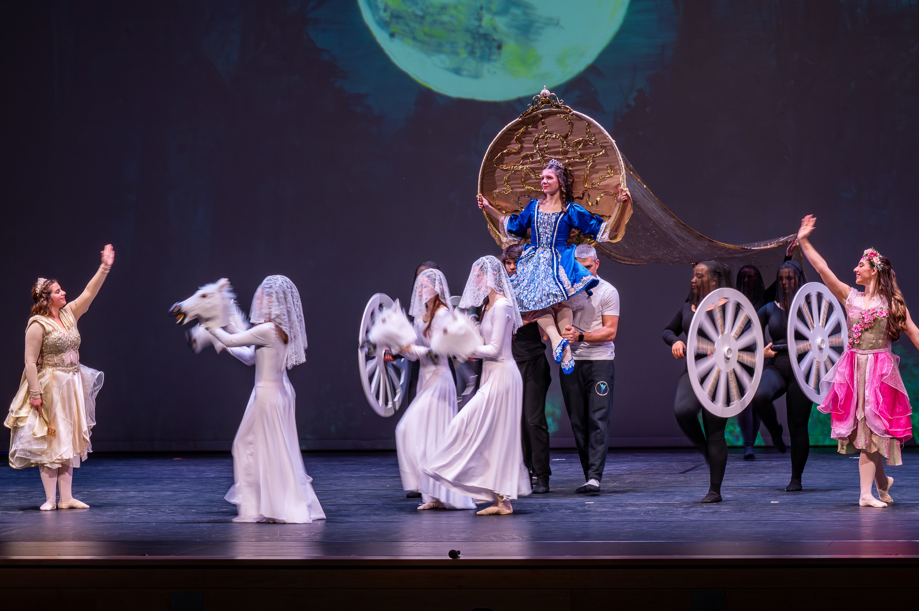 The performance is based on the age-old story of “Cinderella,” set in the fictional city of Isle Town, an anagram of Lewiston. While there are many props on stage, original paintings by local artist Tracey Twitchell Pray were projected on a giant screen in the background. All the costumes were handmade by Lana Hall, Alia Stock and Tess Gregory. Props were made by local artisans.